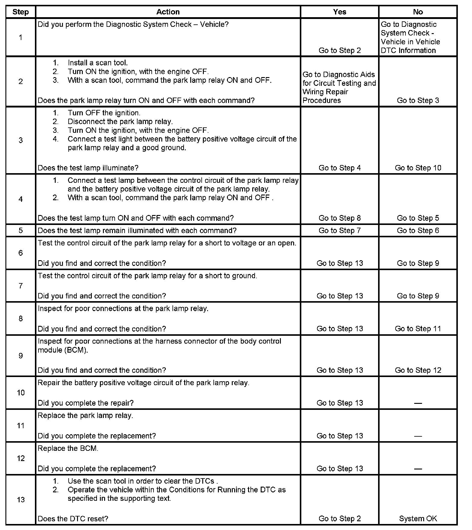 - When the BCM receives a park lamp ON command and the park lamp relay control circuit is shorted to voltage.