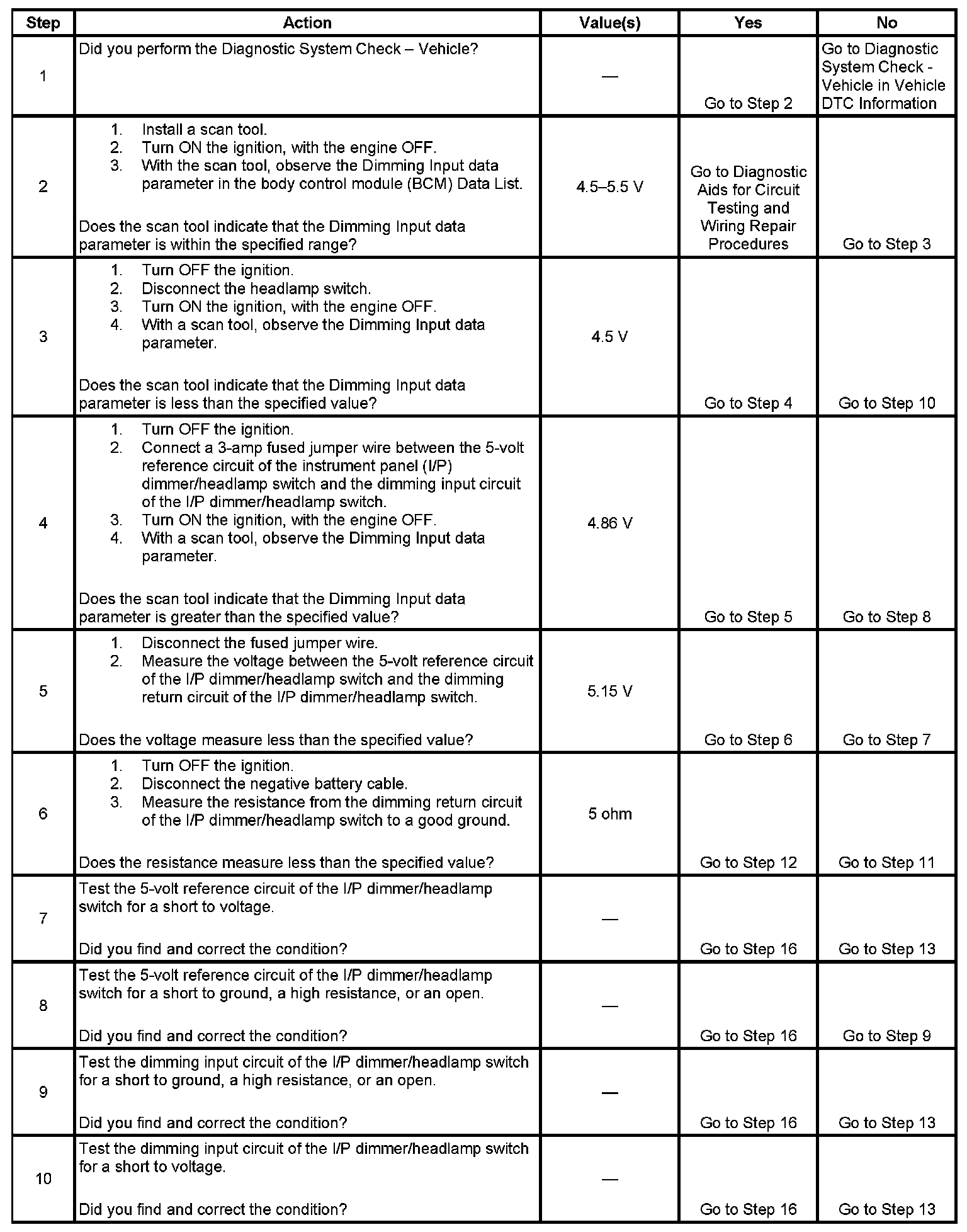 The body control module (BCM) directly sends a 5-volt reference voltage to the instrument panel (I/P) dimmer switch which is then adjusted based on the I/P dimmer switch position and returned as a dimming return and dimming input to the BCM. The BCM uses this signal to directly control the desired level of instrument panel illumination lamp intensity.