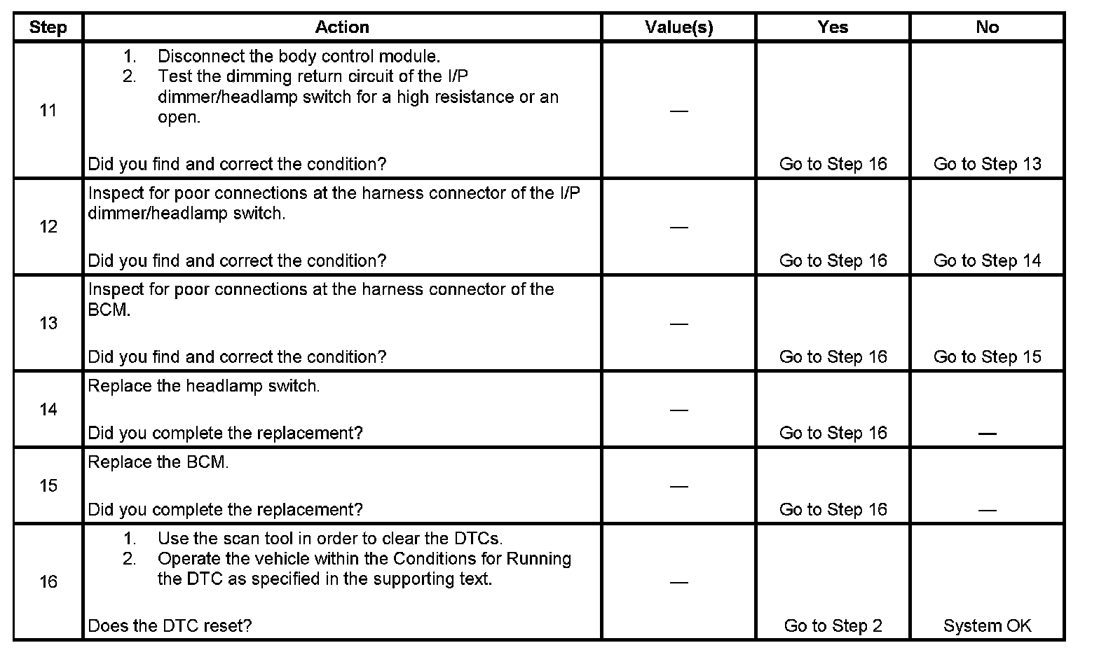 6. This step tests for a high resistance or an open in the dimming return circuit.