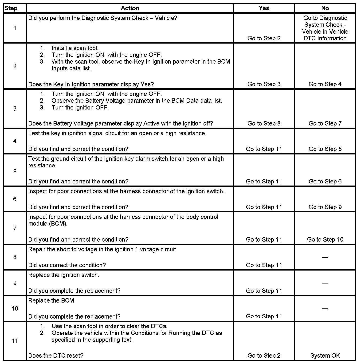 The body control module (BCM) monitors the ignition key alarm switch. When the key is in the ignition, the ignition key alarm switch is closed with the signal circuit as low. When the key is not in the ignition, the ignition key alarm switch is open with the signal circuit as high.