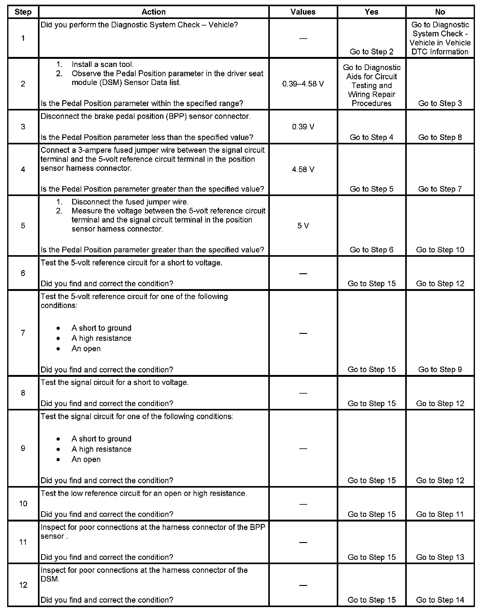The driver seat module (DSM) monitors the location of the adjustable pedals using the brake pedal position (BPP) sensor. The BPP sensor is supplied with 5-volt reference and ground circuits from the DSM. The position sensor signal circuit is referenced from ground within the DSM. The signal voltage monitored by the DSM ranges from 0.39-4.58 volts and is determined by the wiper location on the resistor within the position sensor. The position sensor circuit voltage level is used by the DSM to determine the position of the adjustable pedals when storing or recalling memory position settings.