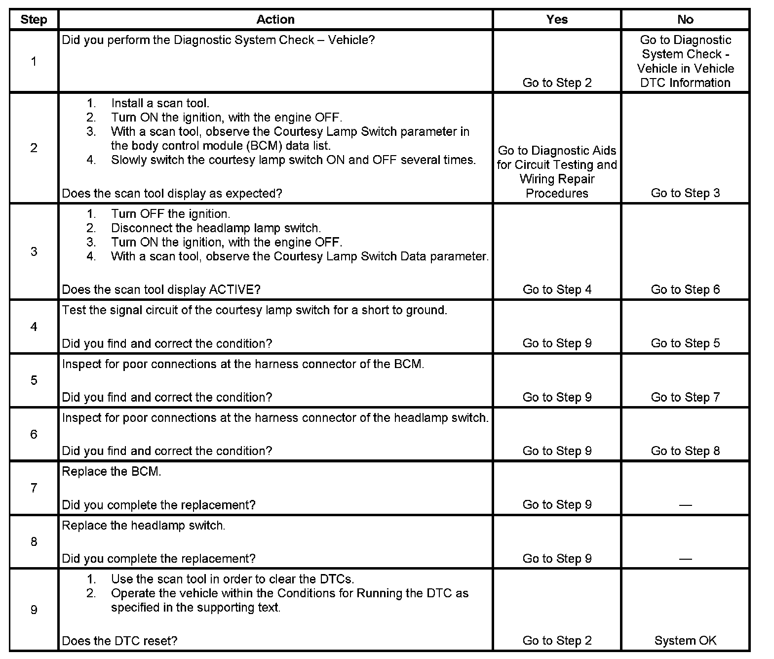 The body control module (BCM) monitors the courtesy lamp switch signal circuit in order to determine when the courtesy/dome lamps should be illuminated. When the BCM senses that the courtesy lamp switch signal circuit is grounded when the switch is activated, the BCM will illuminate the courtesy/dome lamps.
