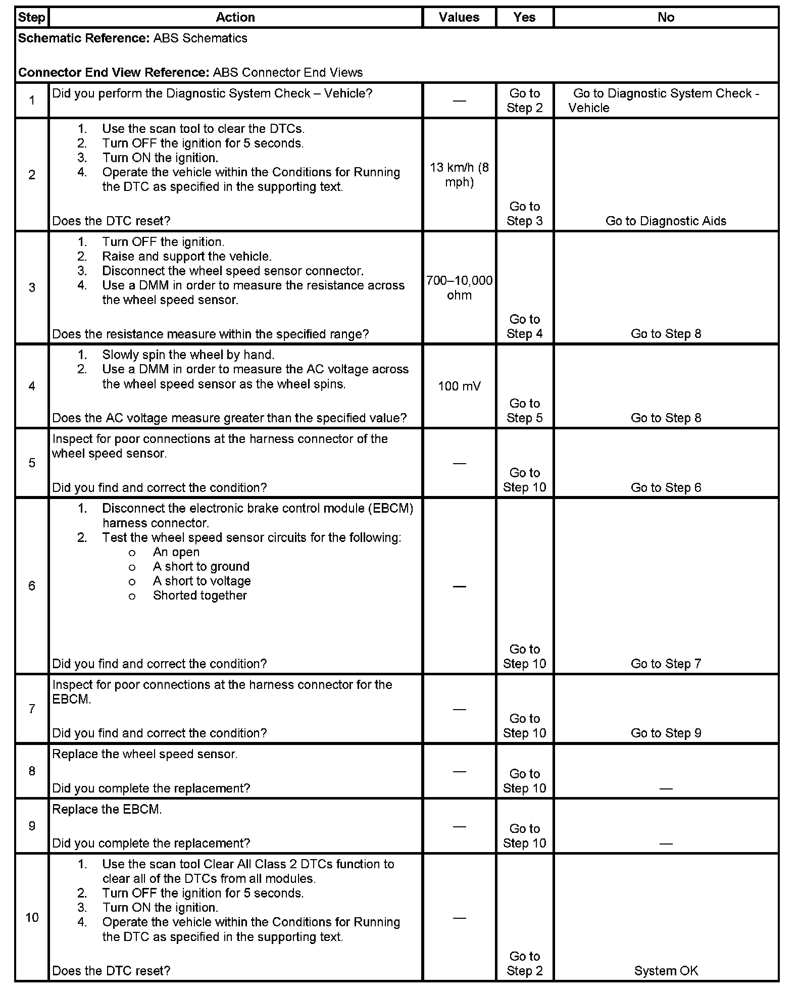^ The EBCM detects the absence of a wheel speed sensor signal for 5 seconds. If more than one absent wheel speed sensor signal is detected, the condition must be present for 120 seconds to set DTCs.