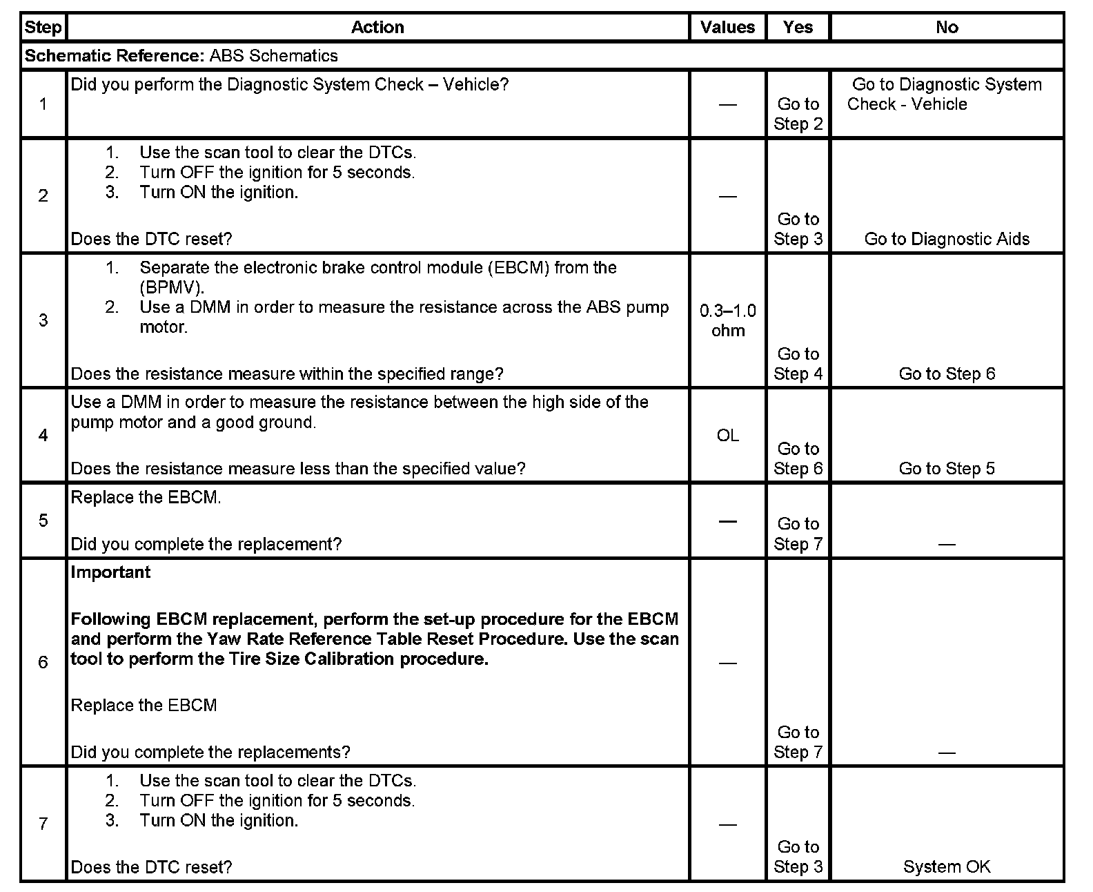 3. A shorted ABS pump motor may damage the contacts within the system relay. It is imperative that the steps in the table be followed to prevent damage to a replacement EBCM.