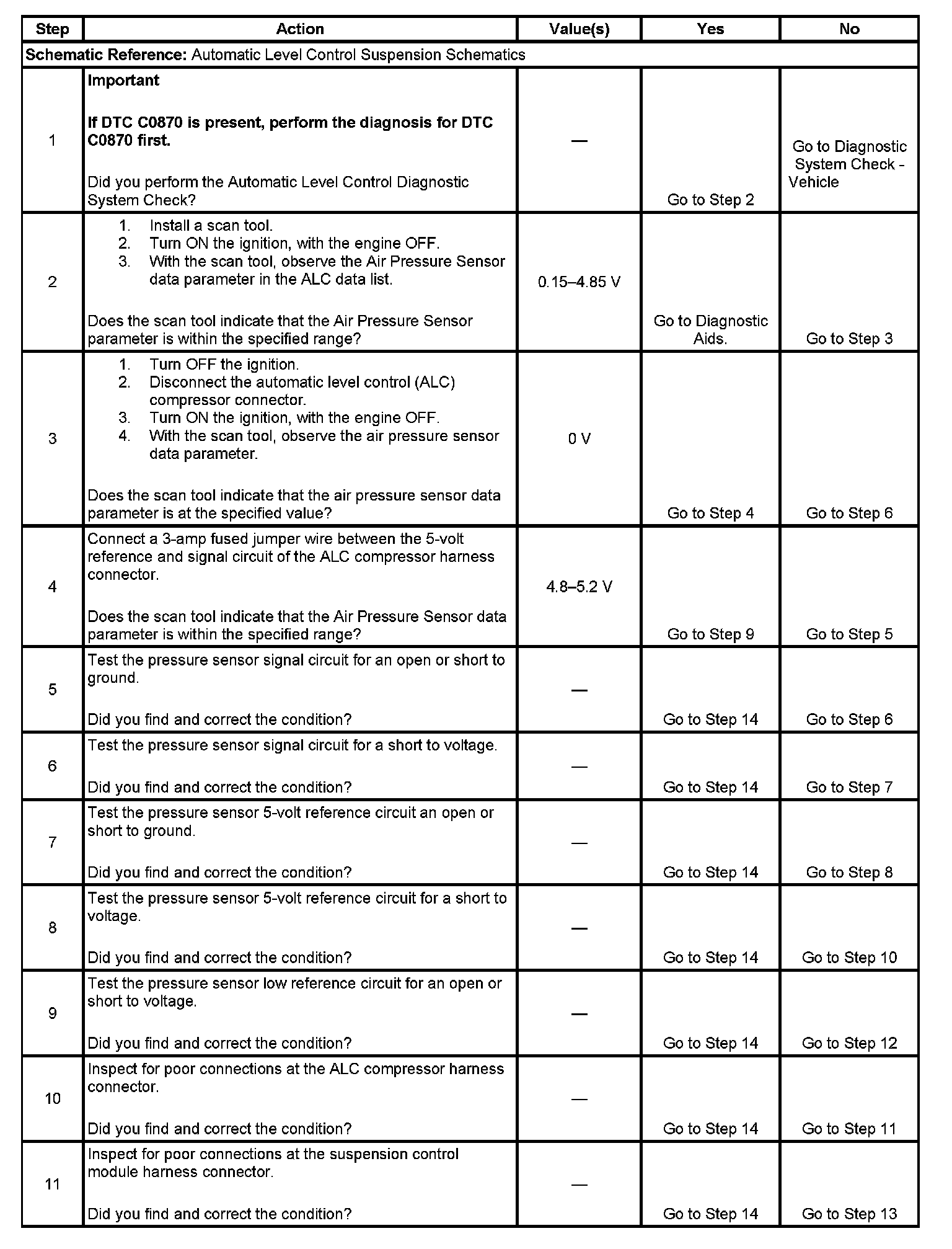 The suspension control module uses a 5-volt analog air pressure sensor to determine the amount of air pressure in the Automatic Level Control (ALC) system. The valid signal voltage range of the sensor is 0.15-4.85 volts. The sensor signal voltage will increase and decrease within the valid voltage range as system pressure increases and decreases.