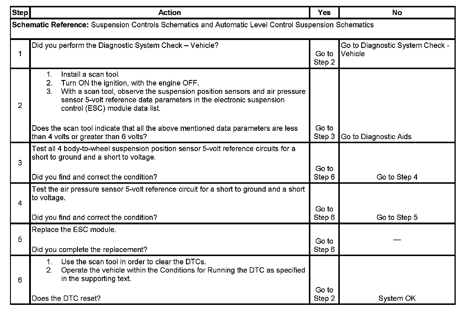 The Electronic Suspension Control (ESC) module provides a common regulated voltage of approximately 5 volts to all 4 of the body-to-wheel suspension position sensors and the air pressure sensor. The ESC module monitors this reference voltage for any malfunctions that could prevent it from outputting a regulated 5 volts.