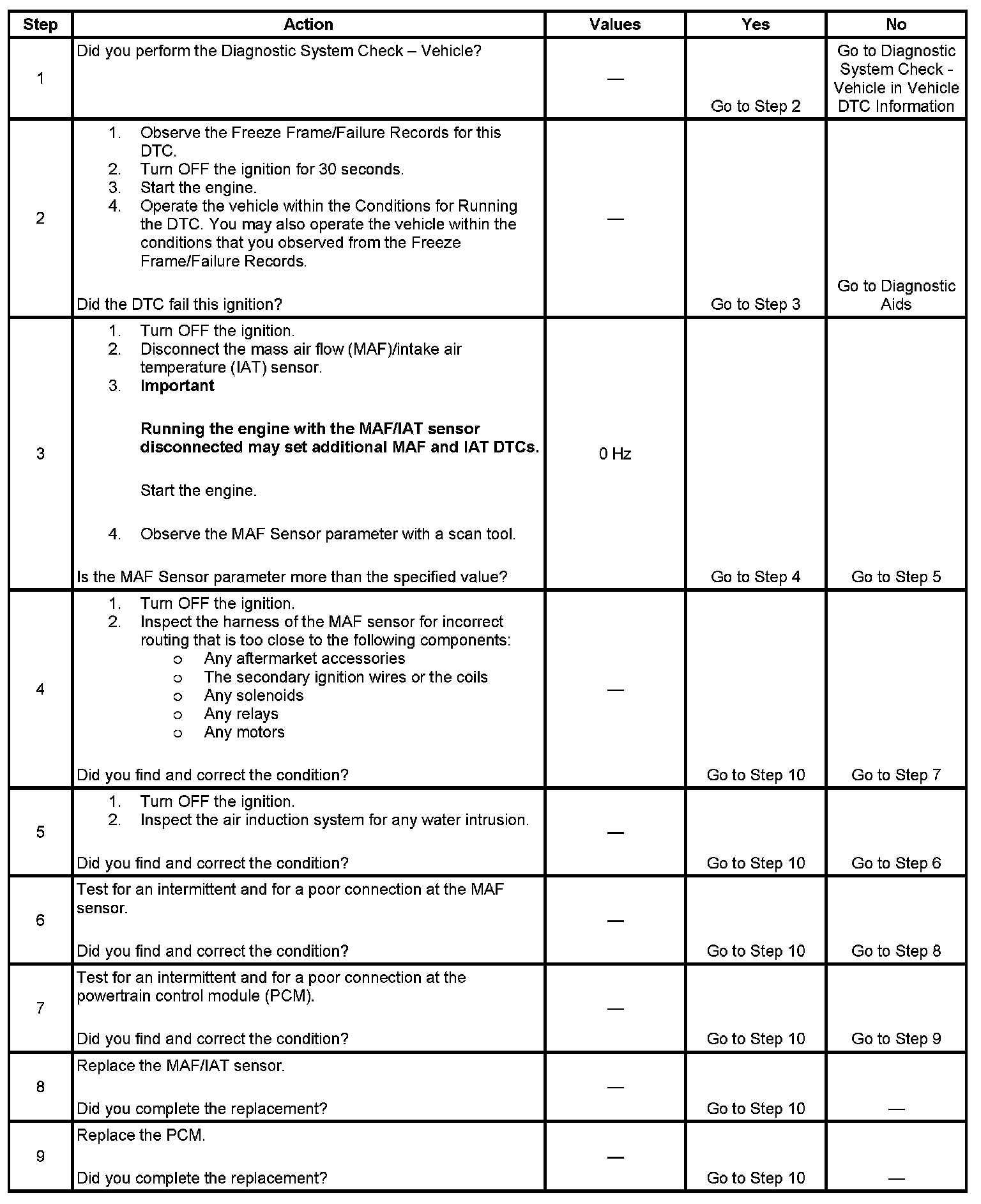 - Inspect the air induction system for any water intrusion. The water rapidly cools the hot sensing elements in the sensor causing a false indication of excessive airflow. Any water that reaches the MAF sensor will skew the sensor and may cause this DTC to set.