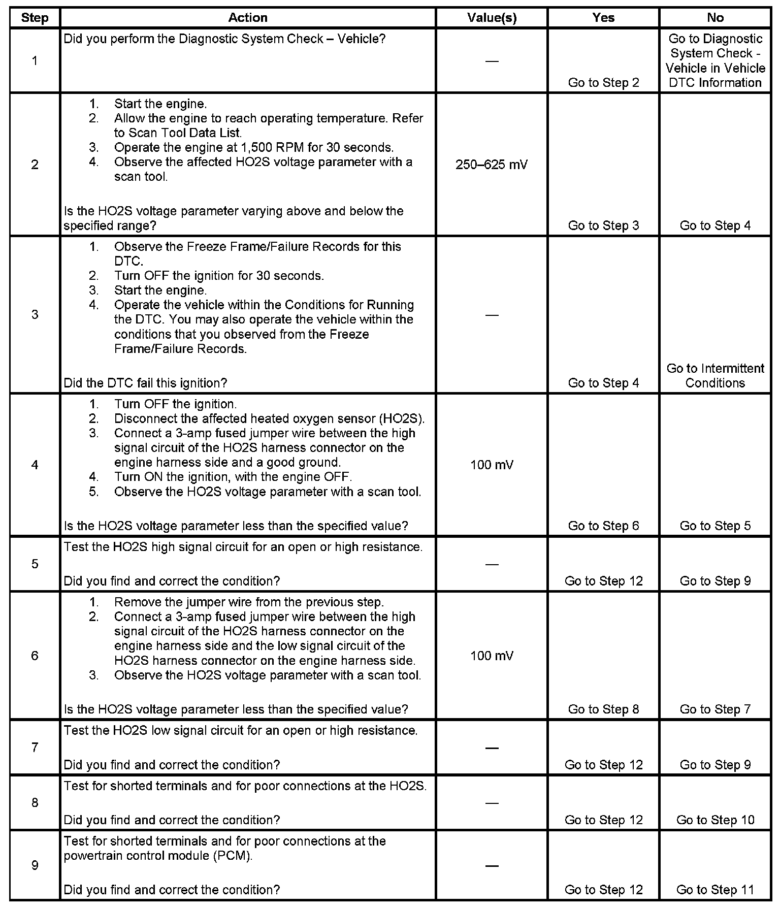 Heated oxygen sensors (HO2S) are used for fuel control and post catalyst monitoring. Each HO2S compares the oxygen content of the surrounding air with the oxygen content in the exhaust stream. The HO2S must reach operating temperature to provide an accurate voltage signal. Heating elements inside the HO2S minimize the time required for the sensors to reach operating temperature. The powertrain control module (PCM) supplies the HO2S with a reference, or bias, voltage of about 450 mV. When the engine is first started the PCM operates in Open Loop, ignoring the HO2S voltage signal. Once the HO2S reaches operating temperature and Closed Loop is achieved, the HO2S generates a voltage within a range of 0-1,000 mV that fluctuates above and below bias voltage. High HO2S voltage indicates a rich exhaust stream; low HO2S voltage indicates a lean exhaust stream. This diagnostic will only run once per ignition cycle. The PCM monitors the rich-to-lean and lean-to-rich transition time. A transition is defined as, the HO2S voltage changes from greater than 625 mV to less than 250 mV or from less than 250 mV to greater than 625 mV. If the PCM detects that the transition time is too long, DTC P0133 sets for HO2S bank 1 sensor 1 or P0153 sets for HO2S bank 2 sensor 1.