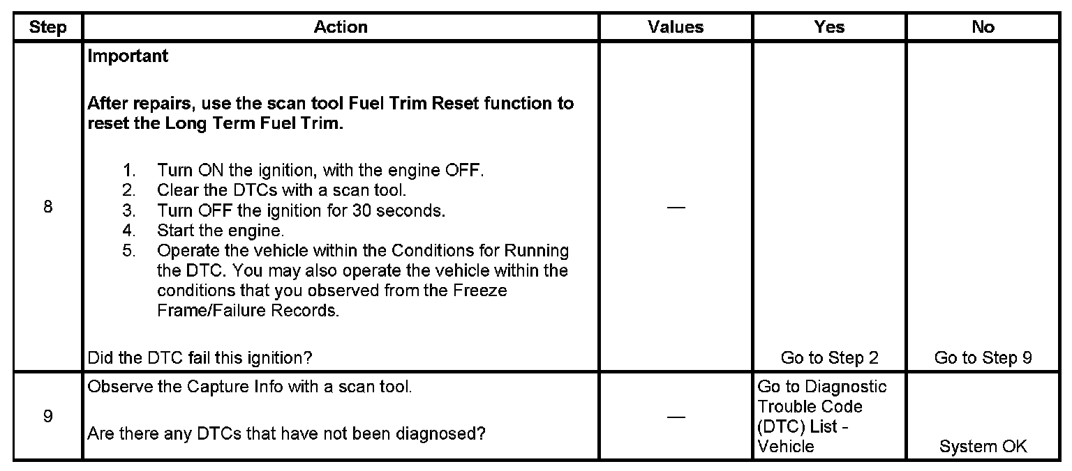 - DTCs P0053, P0054, P0059, P0060, P0101, P0102, P0103, P0106, P0107, P0108, P0131, P0132, P0133, P0134, P0135, P0136, P0137, P0138, P0140, P0141, P0151, P0152, P0153, P0154, P0155, P0156, P0157, P0158, P0160, P0161, P0200, P0300, P0442, P0443, P0446, P0449, P0452, P0453, P0455, P0496, P0506, P0507, P1133, P1134, P1153, P1154, P2A01, or P2A04 are not set.