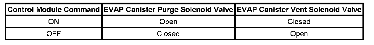 The table illustrates the relationship between the ON and OFF states, and the Open or Closed states of the EVAP canister purge and vent solenoid valves.