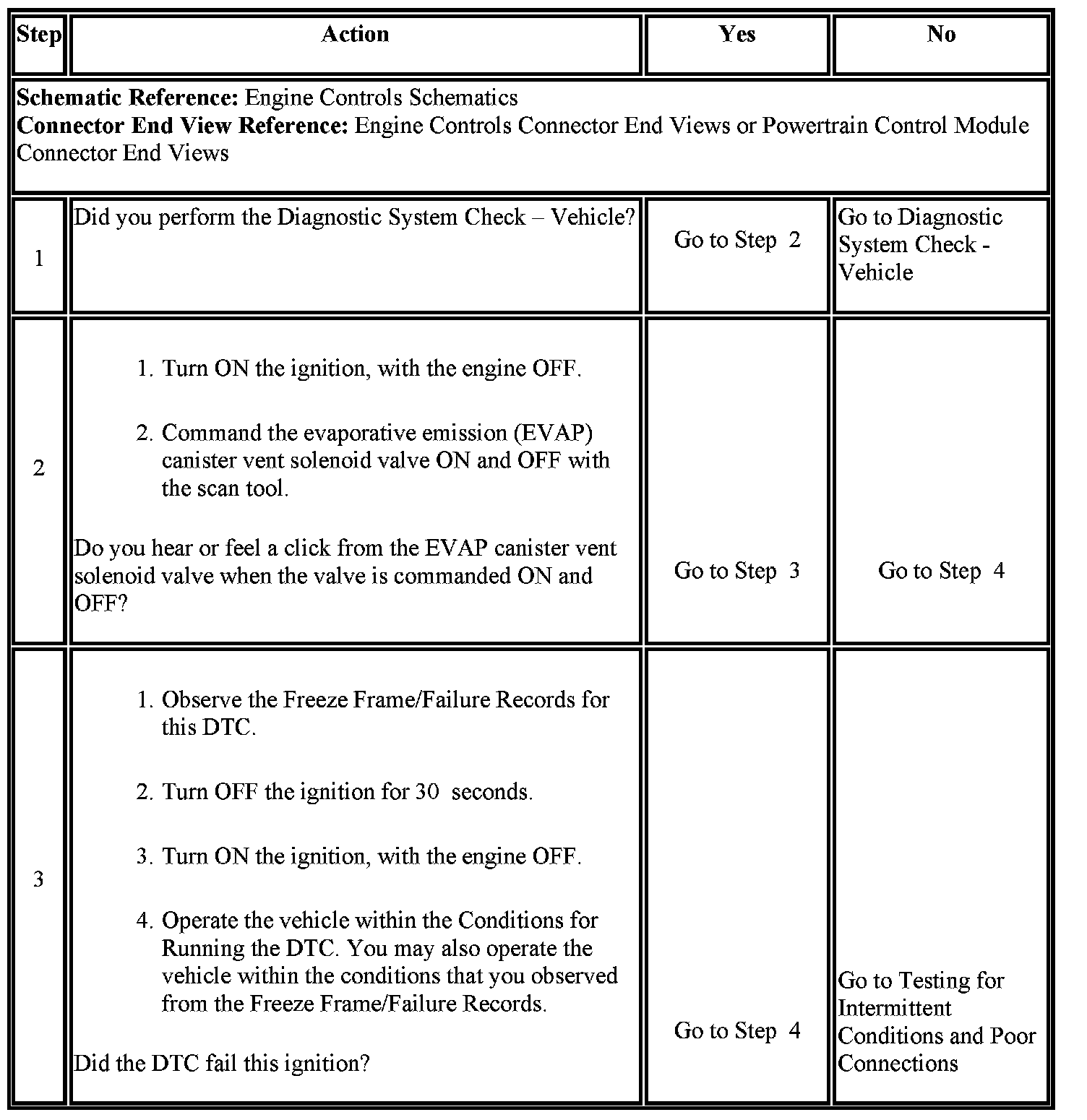 The following table illustrates the relationship between the ON and OFF states, and the OPEN or CLOSED states of the EVAP canister vent solenoid valve.
