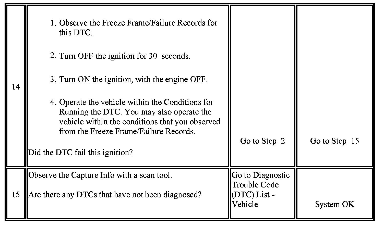 - The control module records the operating conditions at the time the diagnostic fails. The first time the diagnostic fails, the control module stores this information in the Failure Records. If the diagnostic reports a failure on the second consecutive ignition cycle, the control module records the operating conditions at the time of the failure. The control module writes the operating conditions to the Freeze Frame and updates the Failure Records.