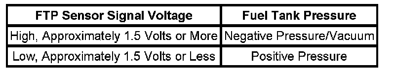 The table illustrates the relationship between the FTP sensor signal voltage and the EVAP system pressure/vacuum.