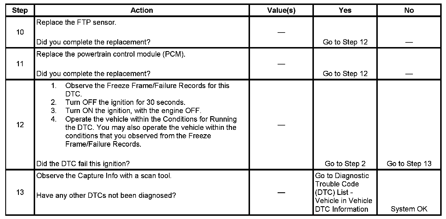 The fuel tank pressure (FTP) sensor measures the difference between the air pressure or vacuum in the evaporative emission (EVAP) system, and the outside air pressure. The control module supplies a 5-volt reference and a low reference circuit to the FTP sensor. The FTP sensor signal circuit voltage varies depending on EVAP system pressure or vacuum. If the FTP sensor signal voltage goes below a calibrated value, this DTC sets.