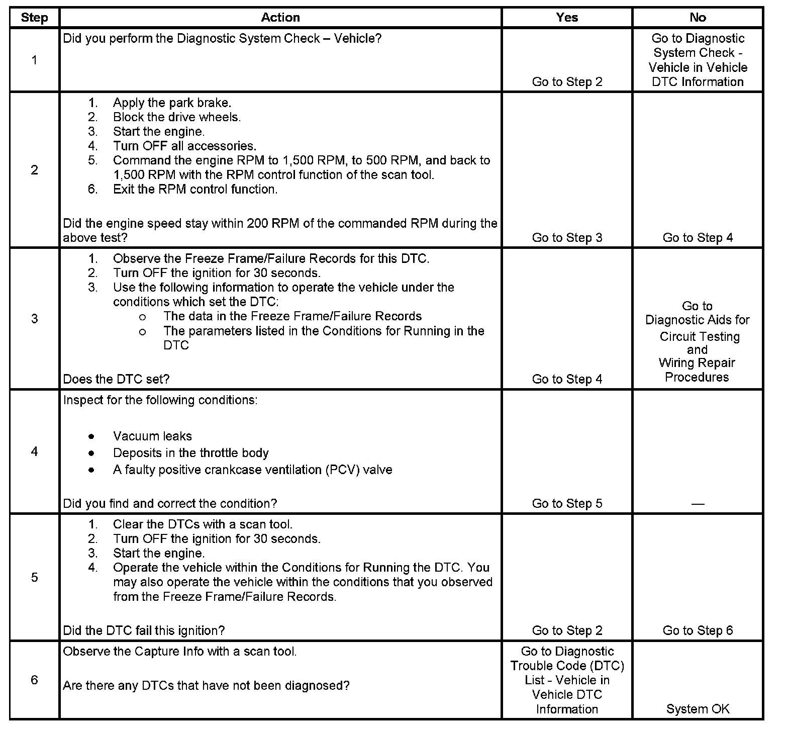 The electronic throttle control (ETC) system uses various inputs from the powertrain control module (PCM). This system uses these inputs to control the idle speed through serial data circuits to the throttle actuator control (TAC) module. The DC motor, which is located on the throttle body, activates the throttle plate. In order to decrease idle speed, the TAC module commands the throttle closed, reducing air flow into the engine, and the idle speed decreases. In order to increase the idle speed, the TAC module commands the throttle plate open, allowing more air in order to bypass the throttle plate. If the actual idle RPM does not match the desired idle RPM within a calibrated time, DTC P0507 sets.