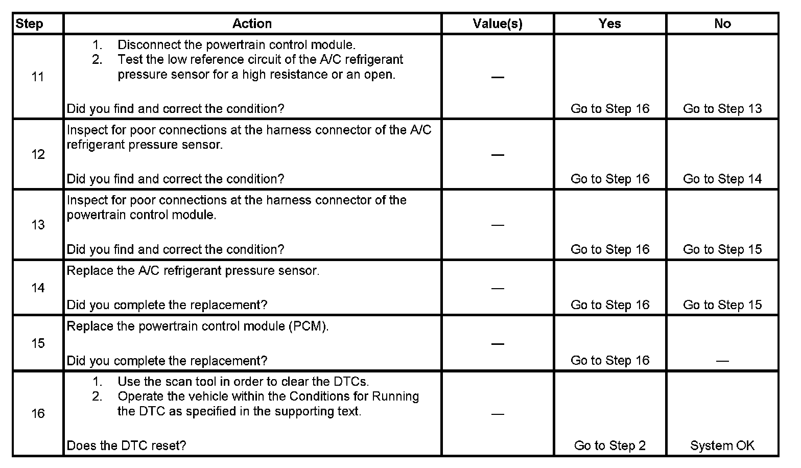 The numbers below refer to the step numbers on the diagnostic table.
