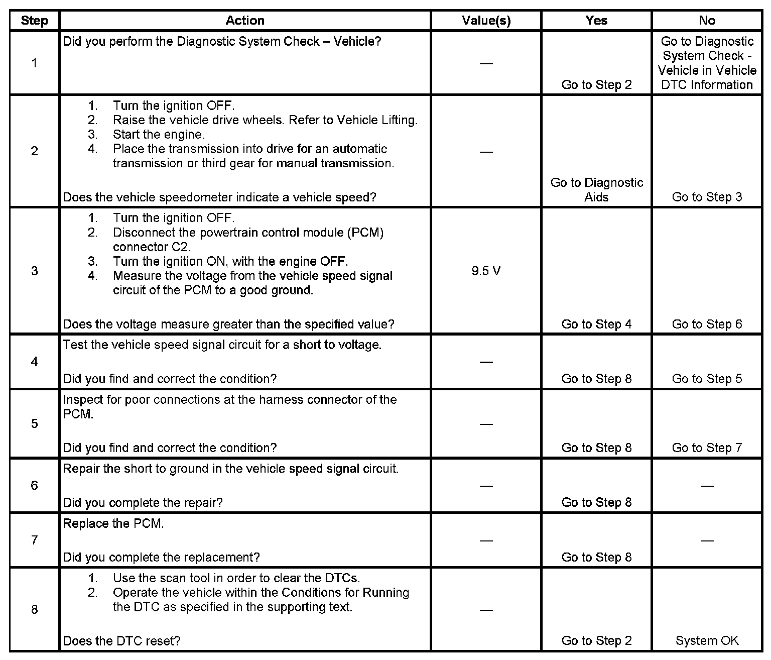 The powertrain control module (PCM) creates the vehicle speed output signal by pulsing the circuit to ground. The PCM pulses the circuit at the same rate as the vehicle speed signal input. The PCM monitors the voltage on the vehicle speed output circuit. If the PCM determines the voltage is out of the normal operating range, a DTC sets.