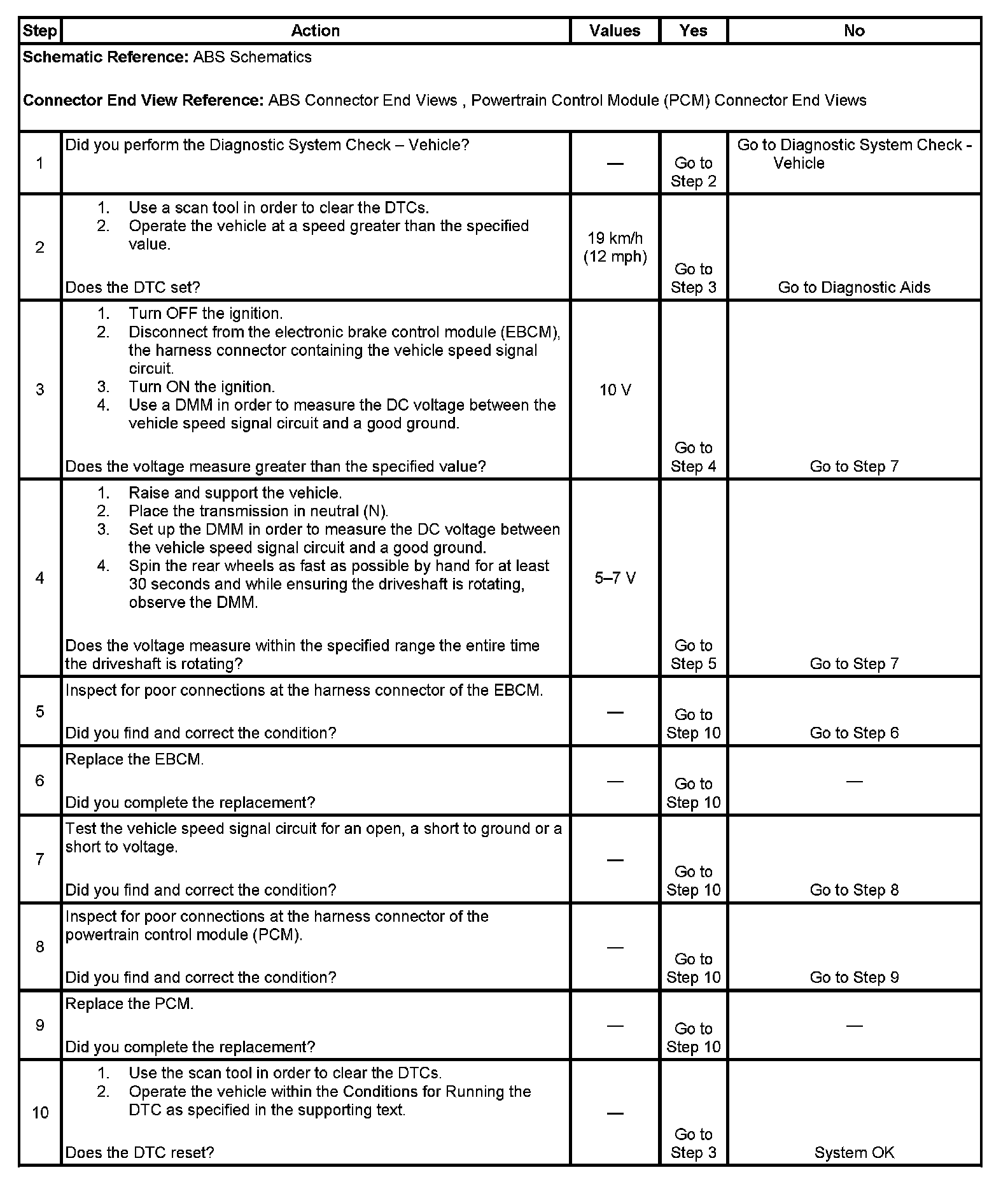 ^ After the DTC is cleared and the ignition is ON, the ABS indicator may remain ON until the EBCM completes a power-up self-test. This test concludes when the vehicle reaches a speed greater than 13 km/h (8 mph) and the wheel speeds are verified by the EBCM.