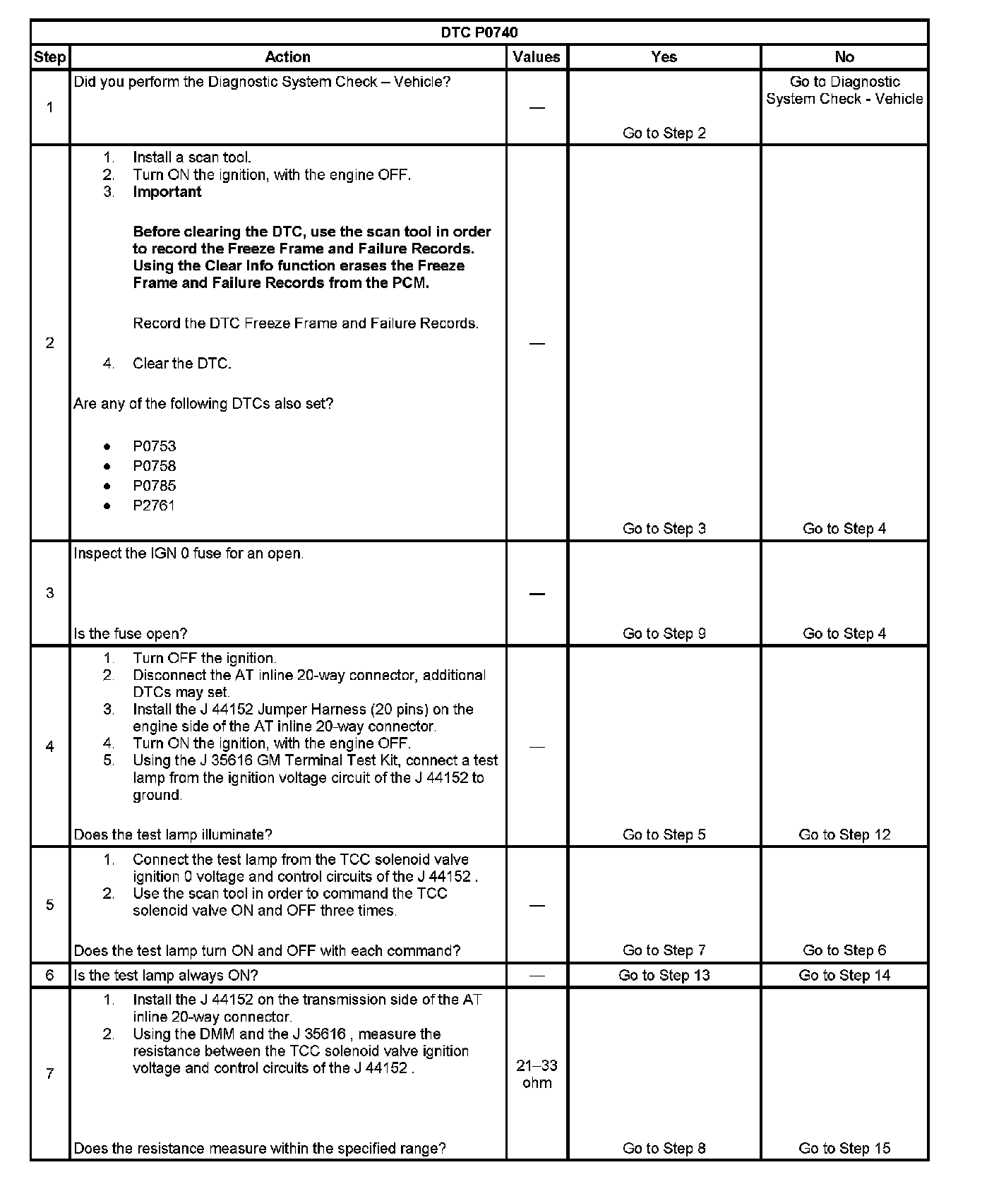 When the PCM detects a continuous open, short to ground or short to voltage in the TCC solenoid valve circuit, then DTC P0740 sets. DTC P0740 is a type B DTC.