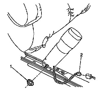 4. Remove the inboard seat belt buckle and nut (1).Disconnect the electrical connection (2).