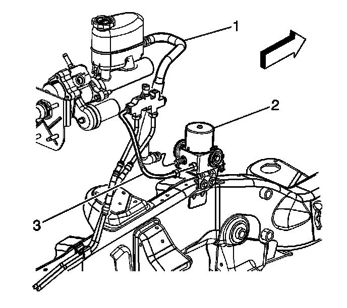 4. Loosen and remove the brake fluid outlet pipe (3). Cap or plug the brake pipe to prevent contamination and brake fluid lose.