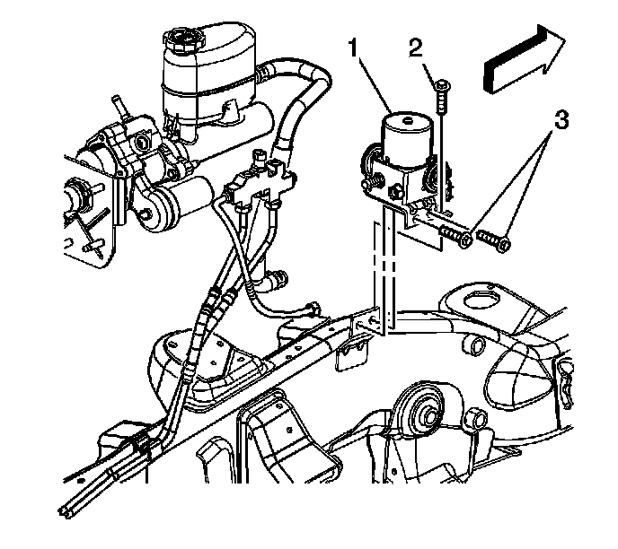 7. Remove the PCP mounting bracket front bolt (2) and mounting bracket side bolts (3).