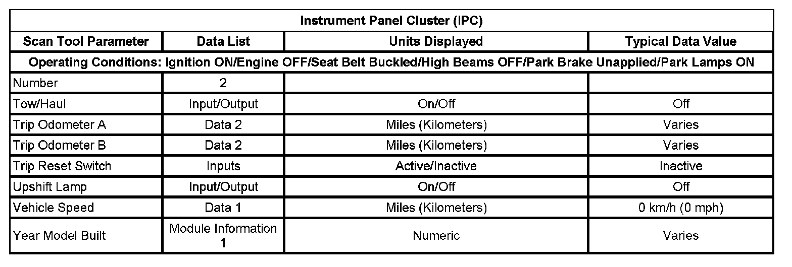 Scan Tool Data List - Instrument Panel Cluster (IPC)