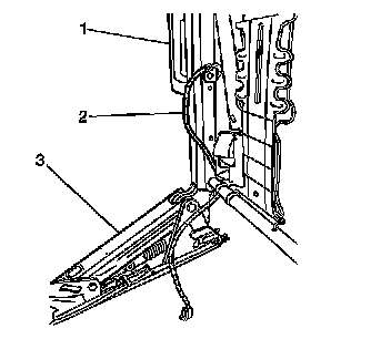 1. Install the module wiring harness (2) to the seat frame (3) while guiding the wiring harness through the appropriate spots on the seat frame.