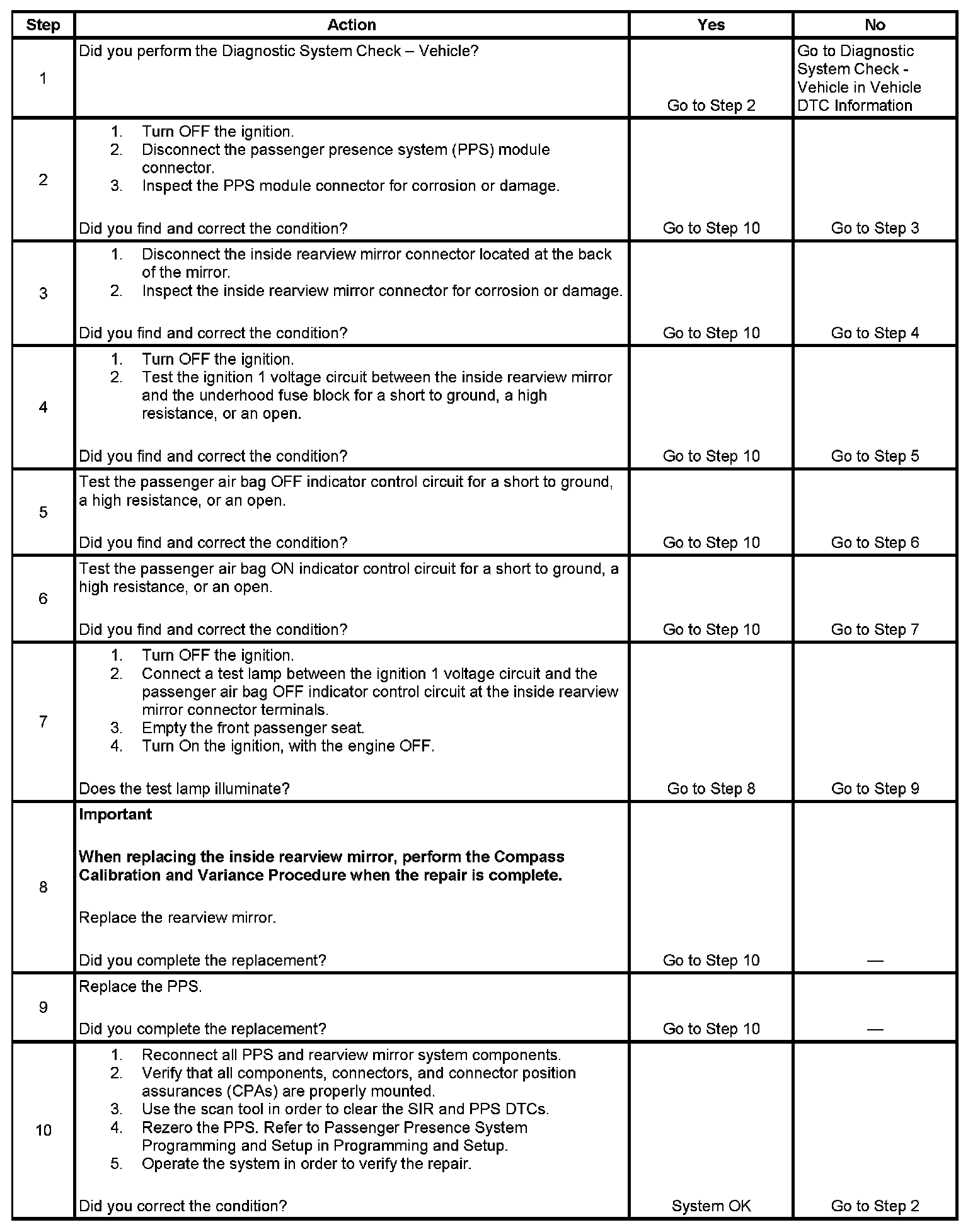 The PASSENGER AIR BAG ON/OFF indicators located on the rearview mirror are used to notify the driver when the passenger presence system (PPS) has enabled or disabled the instrument panel (I/P) inflator module. The PPS air bag indicators will also inform the driver of any PPS malfunctions. When the ignition is turned on, the PPS module is supplied with ignition 1 voltage and commands both PASSENGER AIR BAG ON/OFF indicators ON for 5 seconds. The PPS module conducts tests on the PPS components and circuits while both PASSENGER AIR BAG ON/OFF indicators are ON. If no malfunctions are detected the PPS module will turn the PASSENGER AIR BAG indicator ON or OFF depending on the status of the PPS. If a malfunction is detected, the PPS module will store a DTC, default the PPS to the OFF state and communicate with the SDM that a DTC has been set. The SDM will request the instrument panel cluster (IPC) to turn the AIR BAG indicator ON to notify the driver of a PPS malfunction.