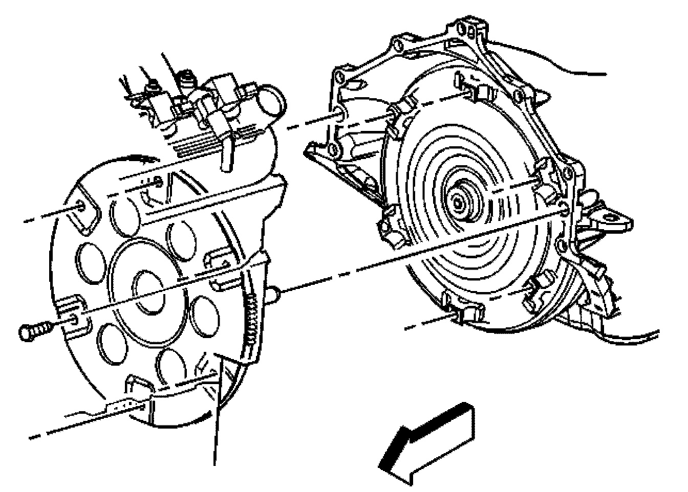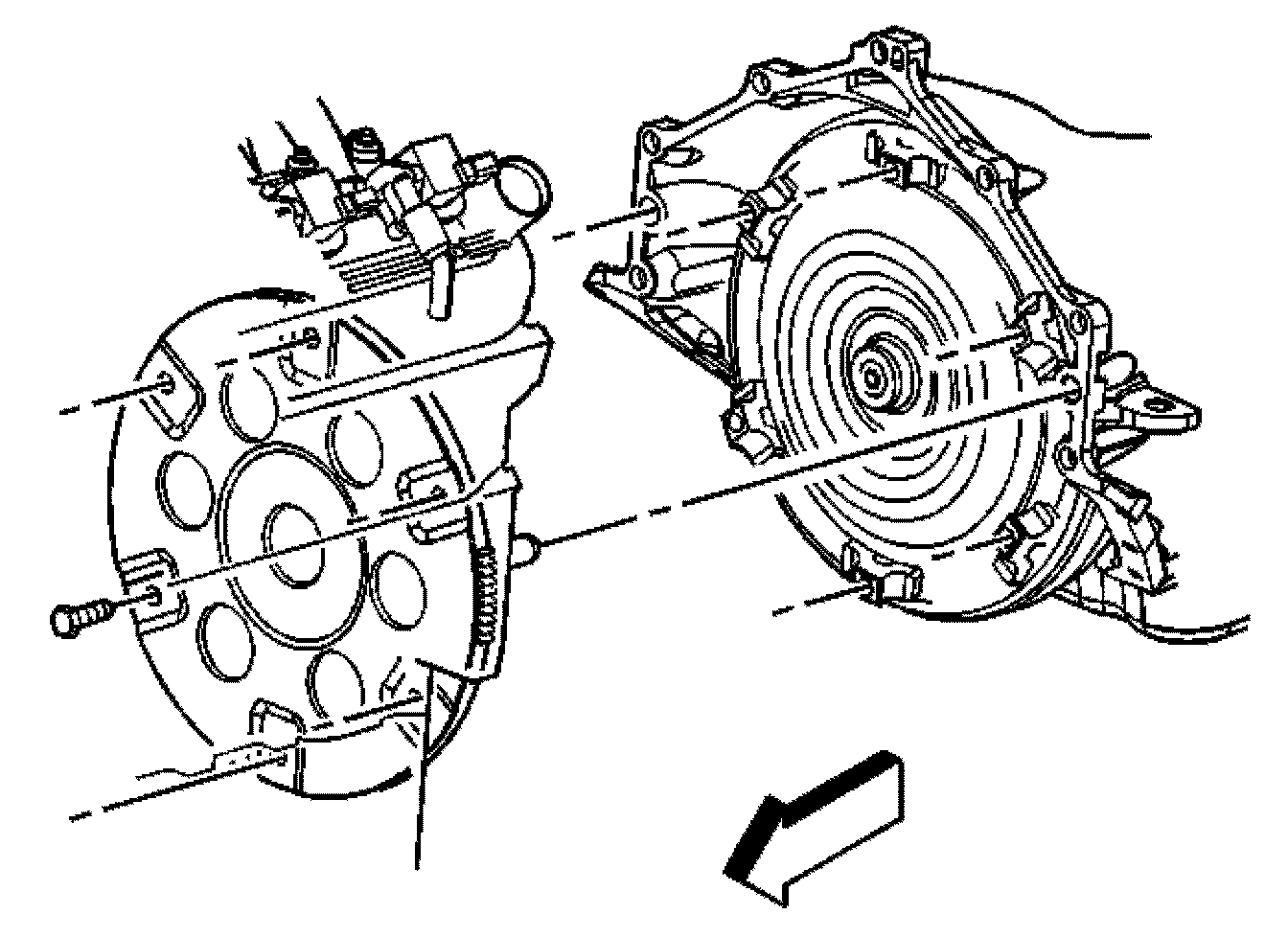 3. Slide the transmission straight onto the locating pins while lining up the marks on the flywheel and the torque converter. The torque converter must rotate freely by hand.