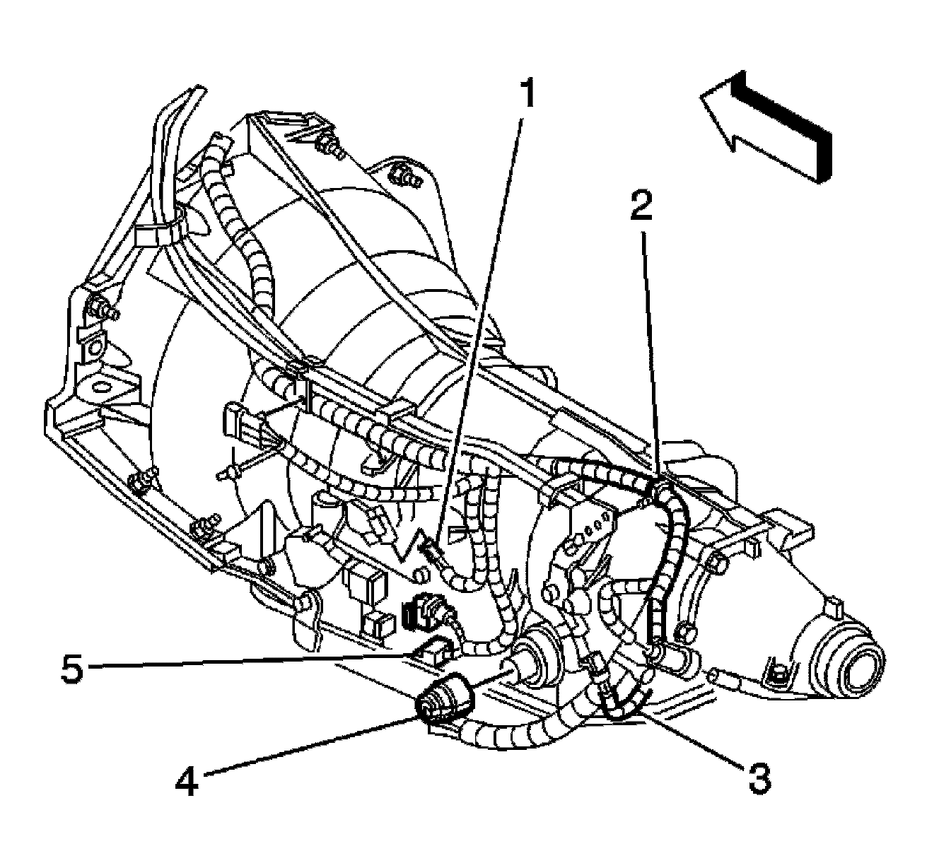17. Disconnect the wire harness clip (2) from the bracket on the left side of the transmission.