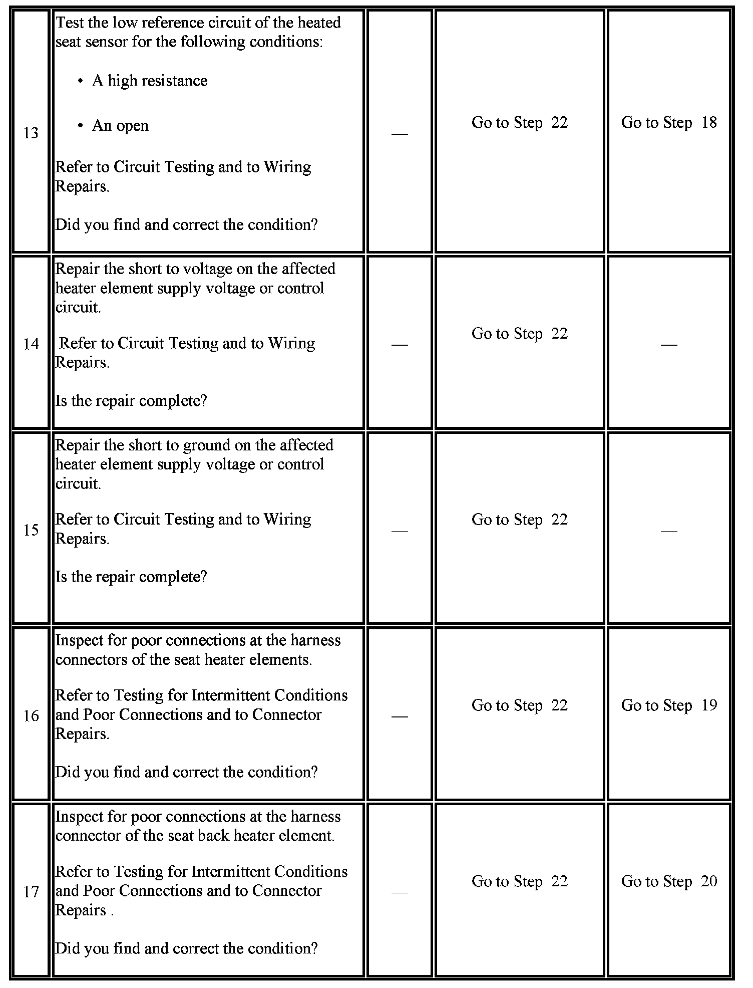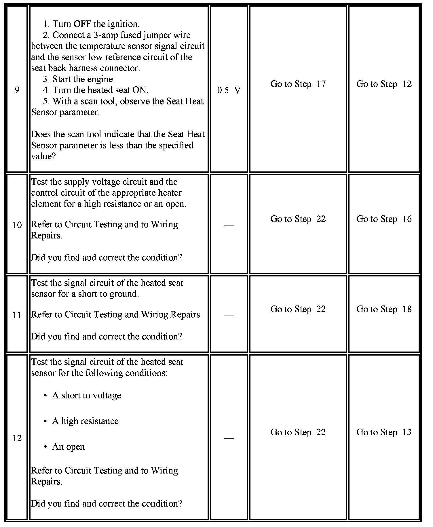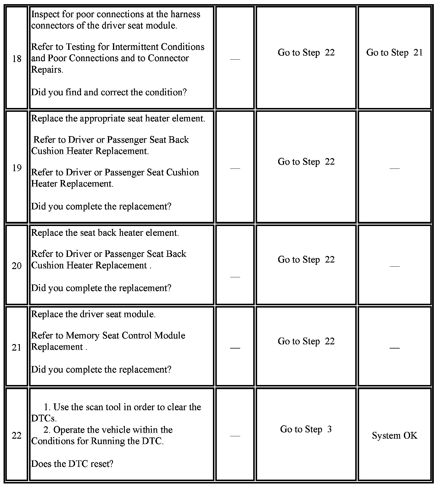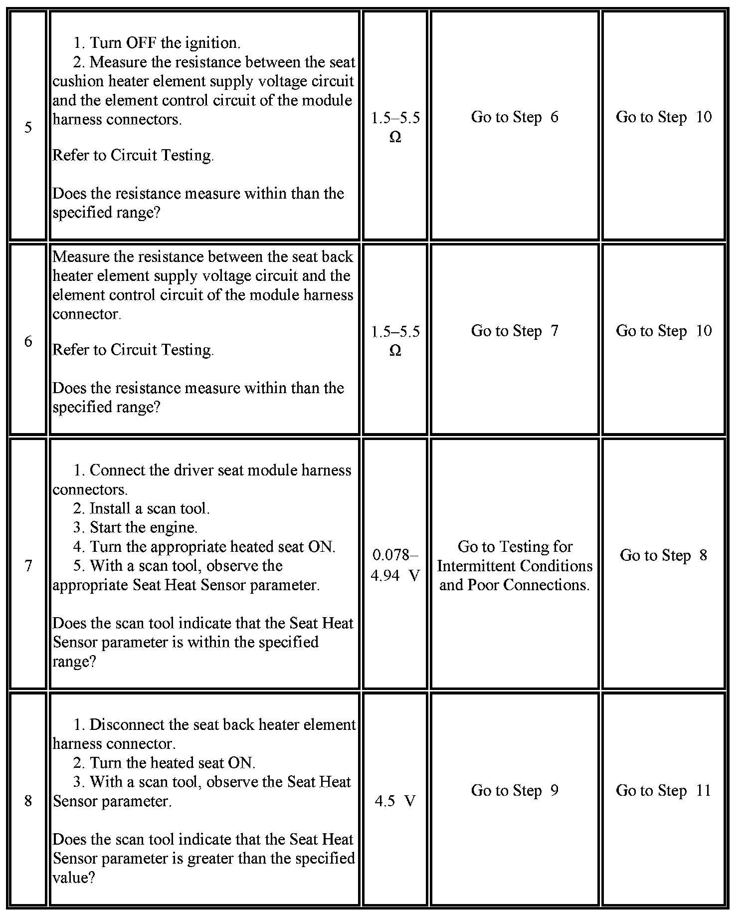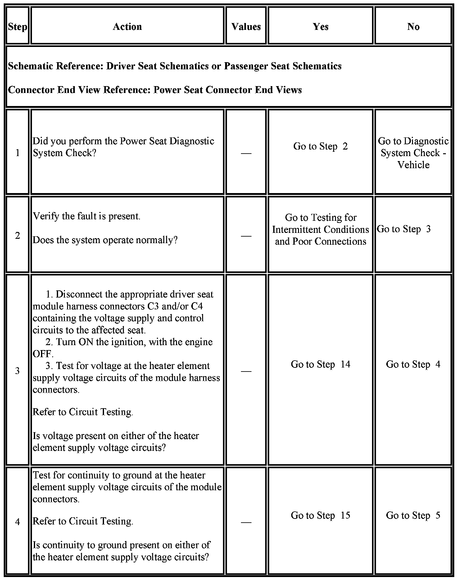 The driver seat module determines by monitoring the heater element control circuits that a short to voltage, short to ground, or open condition exists.