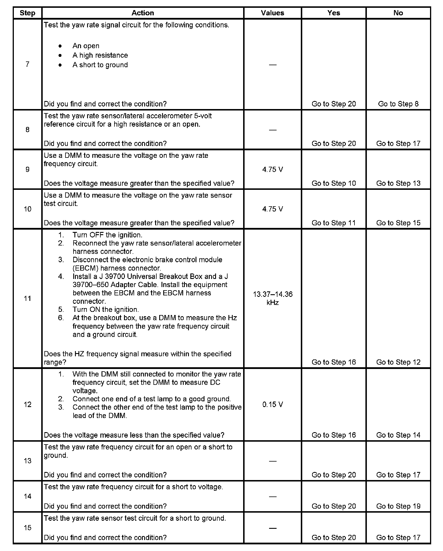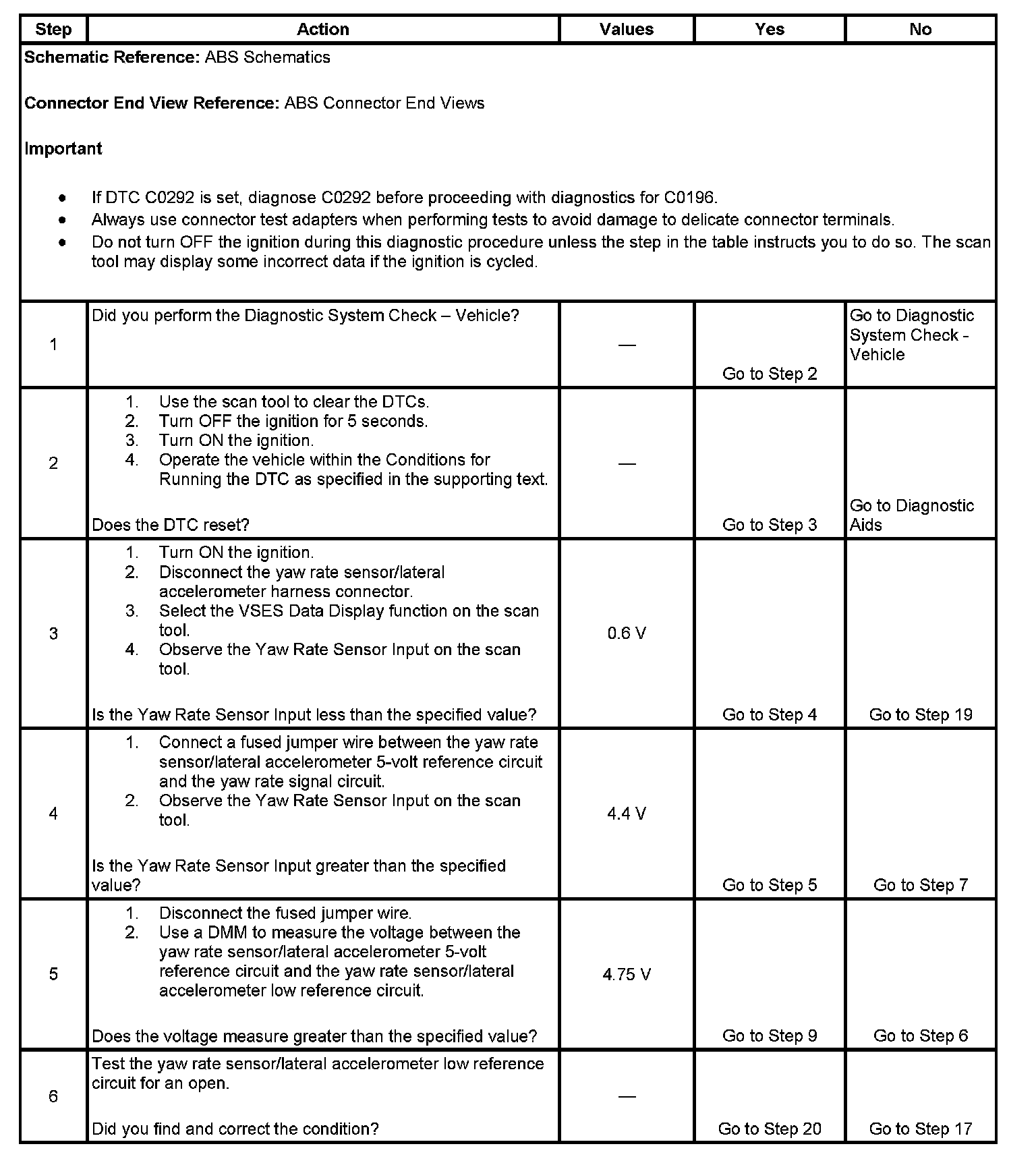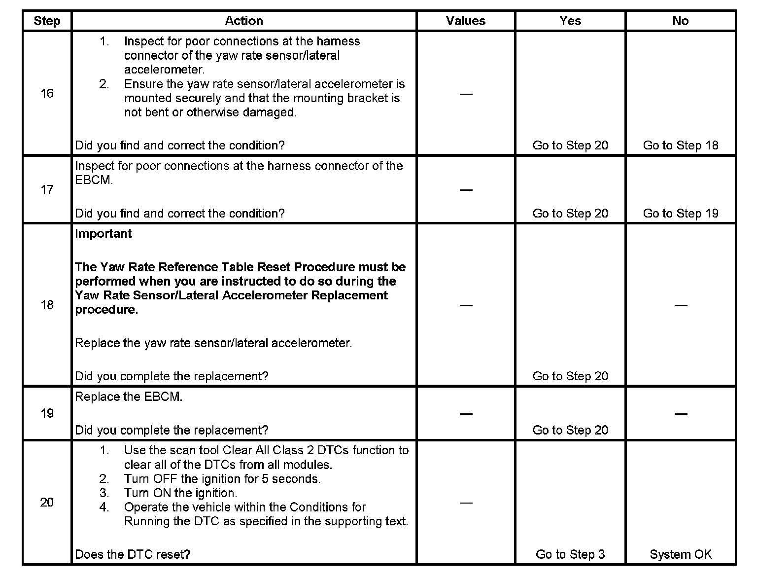 ^ This DTC may also set falsely if the yaw rate sensor is replaced without first following the diagnostic table below. Whenever a new yaw rate sensor is installed, the old sensor must be disconnected, the ignition turned ON for 5 seconds and then OFF, and then the new sensor connected.