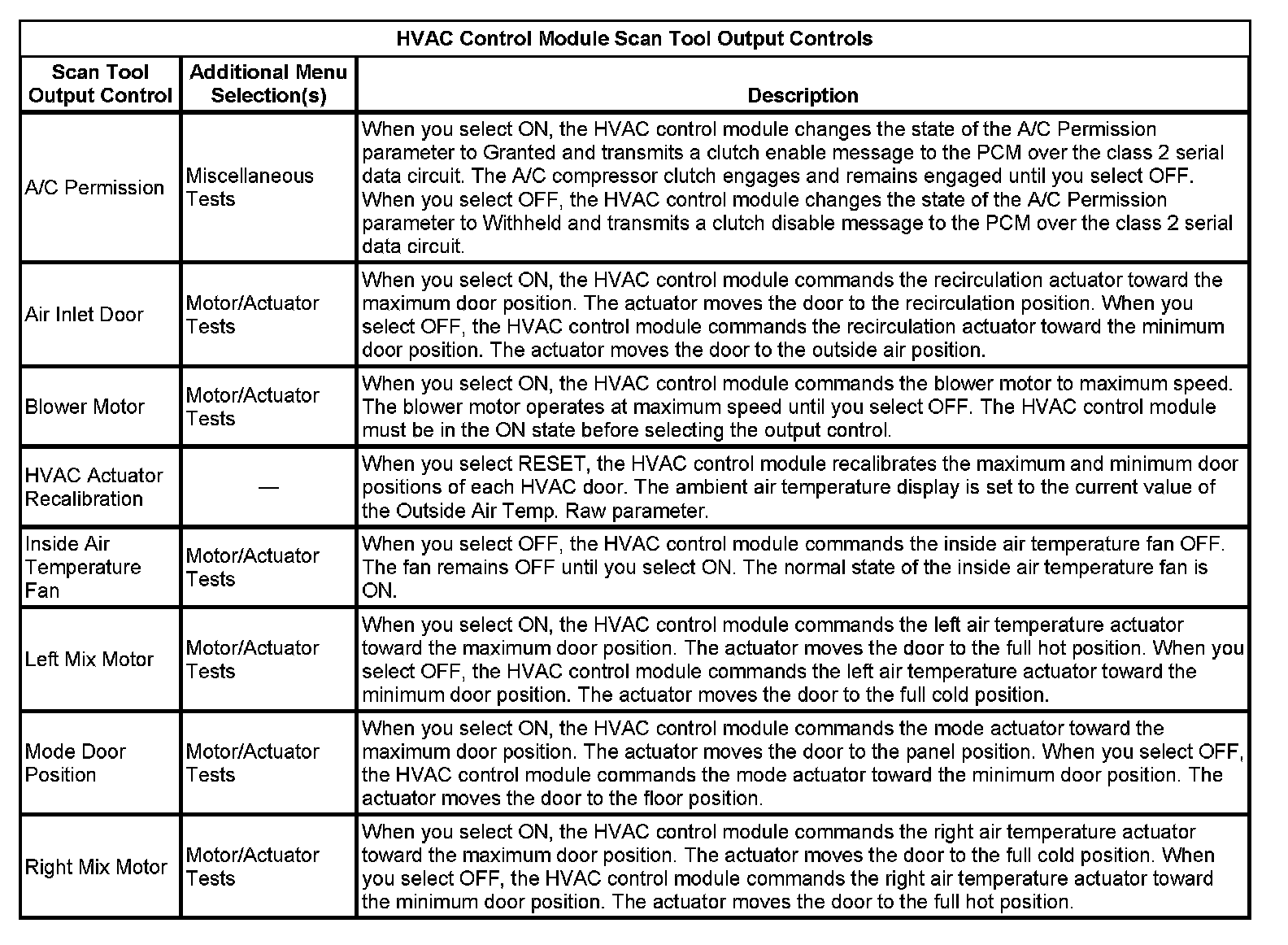 HVAC Control Module Scan Tool Output Controls: