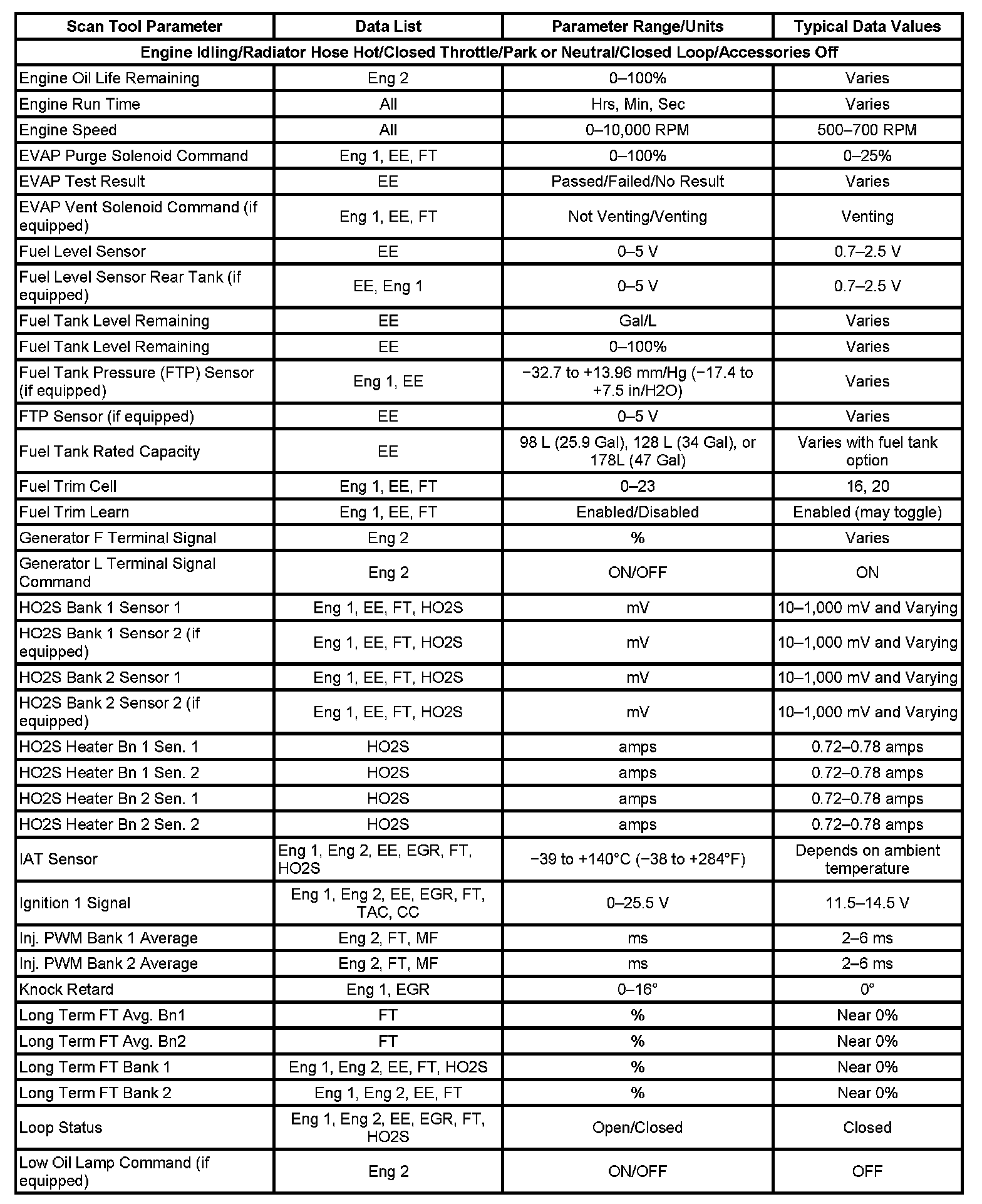 The Engine Scan Tool Data List contains all engine related parameters that are available on the scan tool. The list is arranged in alphabetical order. A given parameter may appear in any one of the data lists, and in some cases may appear more than once, or in more than one data list in order to group certain related parameters together.