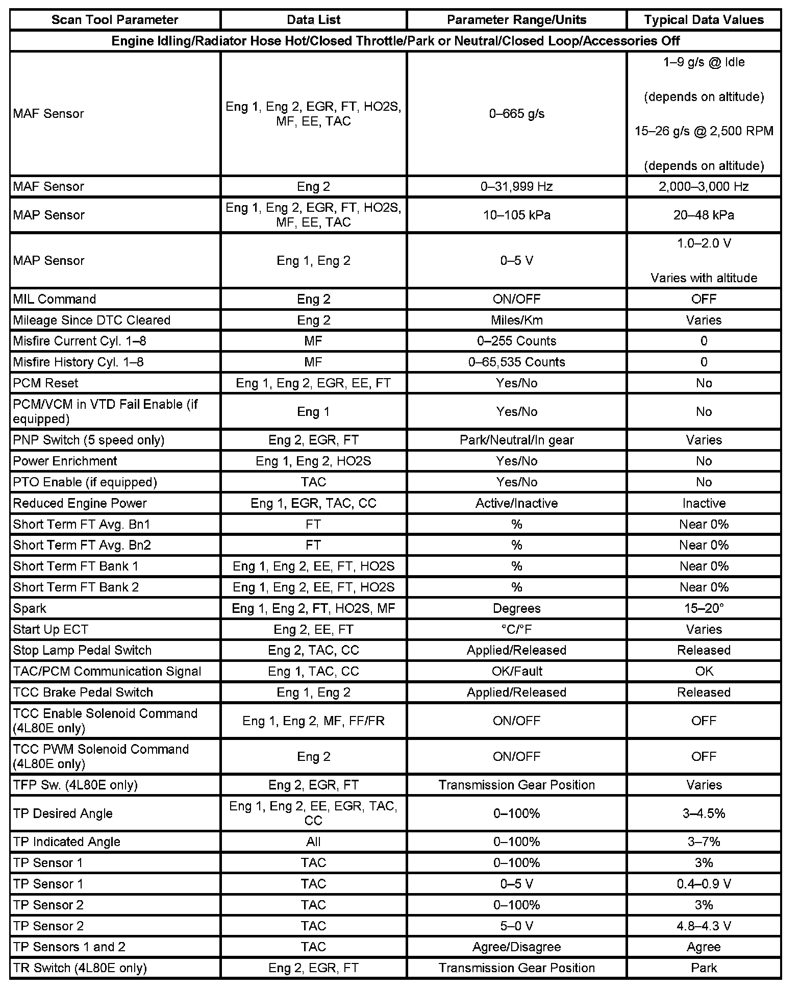 Scan tool values from a properly running engine may be used for comparison with the engine you are diagnosing. The Engine Scan Tool Data List represents values that would be seen on a normal running engine.