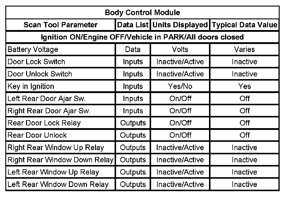 Scan Tool Data List - Body Control Module (BCM)