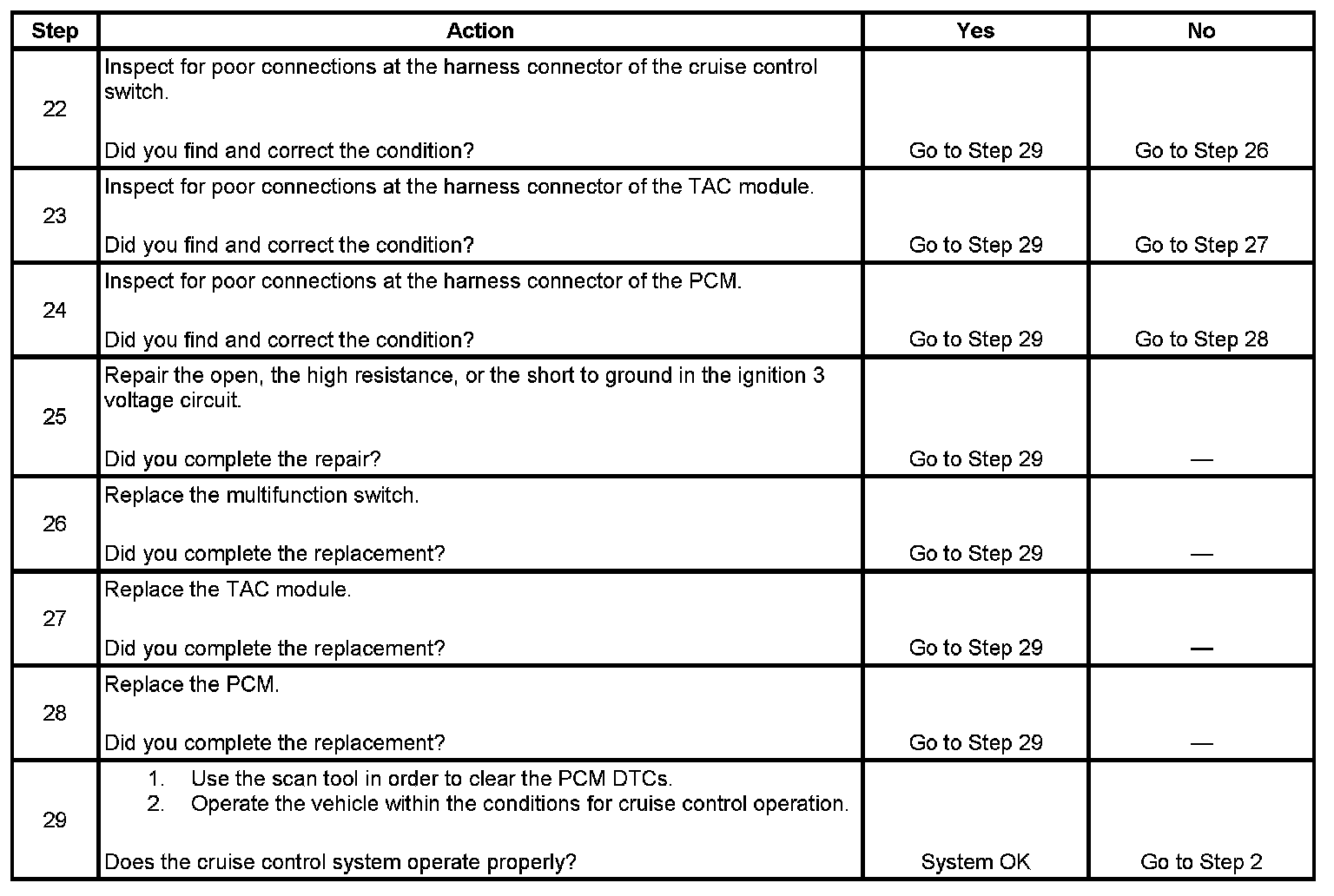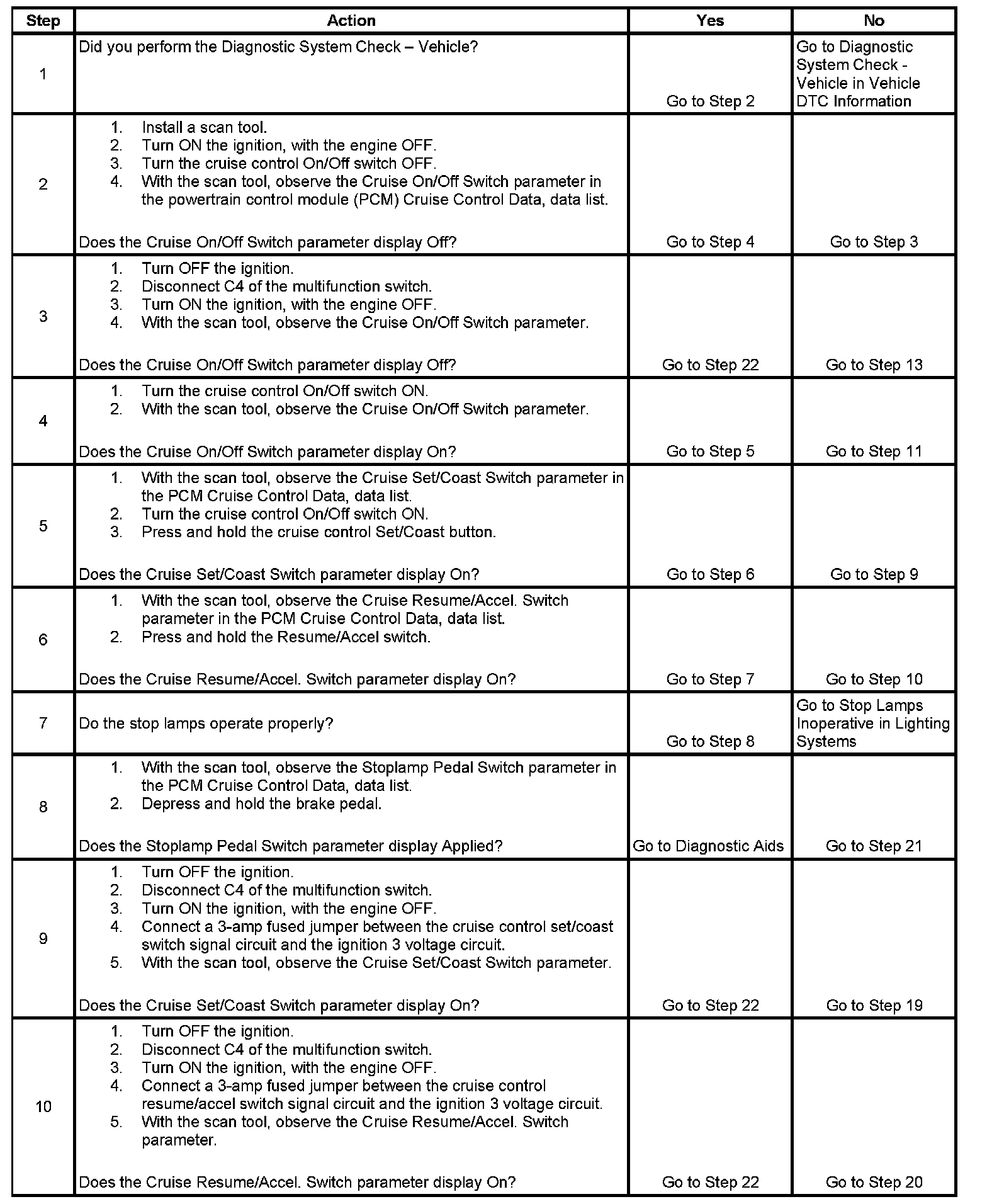 10. This step tests the cruise control resume/accel switch signal circuit for an open or for a high resistance.