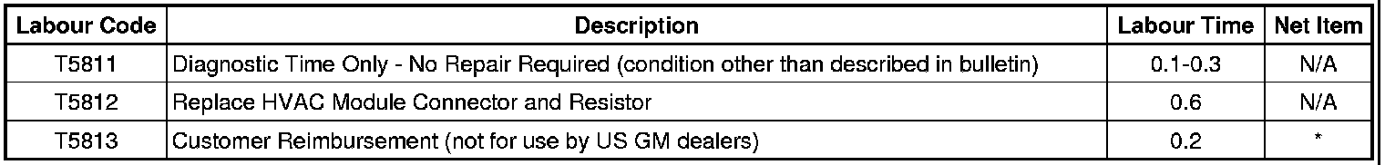 Determine if one or more of the above symptoms is present. If required refer to HVAC diagnostic information in SI. Refer to Resistor Module Connector and Blower Motor Resistor Replacement in this bulletin if one or more of the symptoms is present. Other HVAC repairs are NOT covered in this product safety special coverage bulletin.