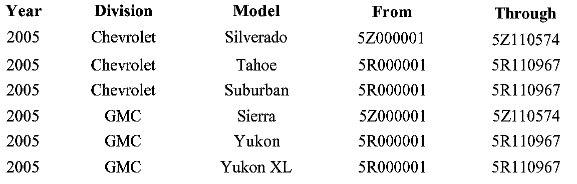 Involved are certain 2005 Chevrolet Silverado, Tahoe and Suburban; GMC Sierra, Yukon and Yukon XL model, vehicles equipped with a 5.3L (RPO L59) E85 V8 engine and built within the VIN breakpoints shown.