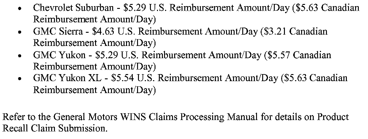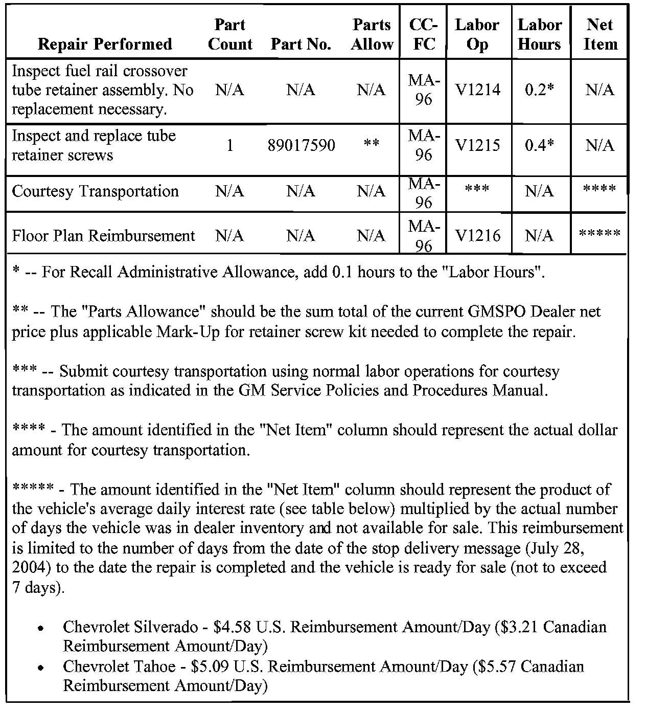 Dealers in possession of vehicles included in the Stop Delivery are eligible for reimbursement of floor plan expense upon completion of this recall. This reimbursement is limited to the number of days from the Stop Delivery message to receipt of the recall parts and/or repair procedures. Floor plan reimbursement beyond these dates is not followed. The amount of reimbursement should be charged as a net amount expense using the recall labor operation provided.