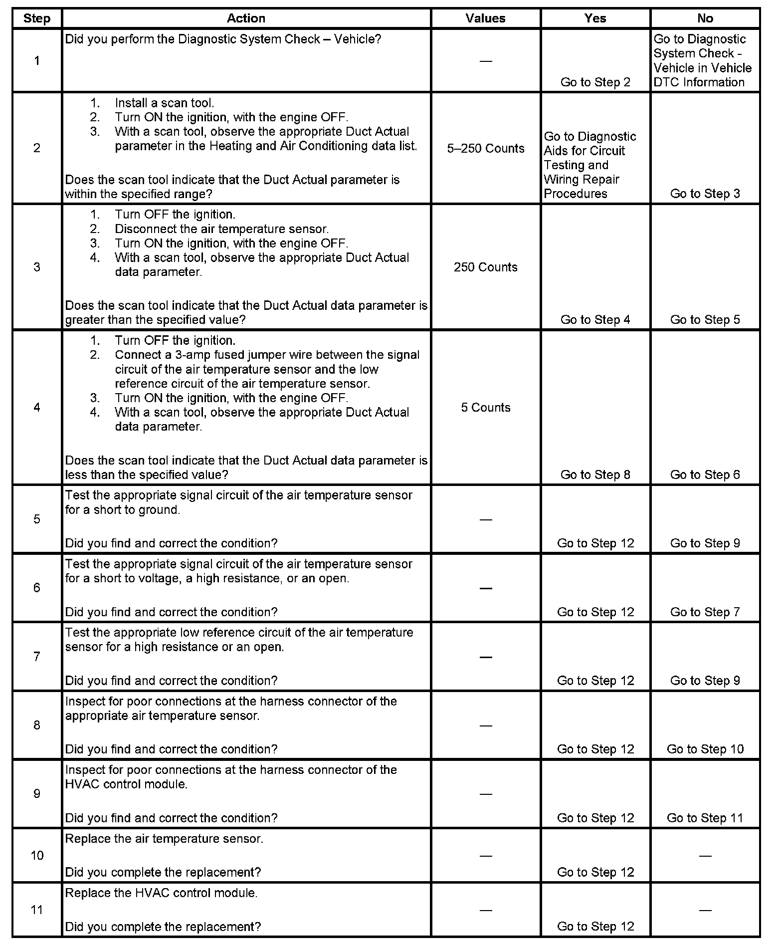 Air temperature sensors allow the HVAC control module to monitor the temperature of the discharge air in the HVAC ducts. The module applies 5 volts to internal input resistors that are connected to the signal circuits of the air temperature sensors. The module provides ground to the air temperature sensors through the low reference circuit. The HVAC control module monitors the voltage drops across the air temperature sensors and uses the inputs for automatic control calculations. When the duct air temperatures are cold, the resistances of the sensors are high and the voltage signals are high. When the duct air temperatures are hot, the resistances of the sensors are low and the voltage signals are low. The HVAC control module converts the voltage values to count values where one volt is approximately equal to 51 counts.