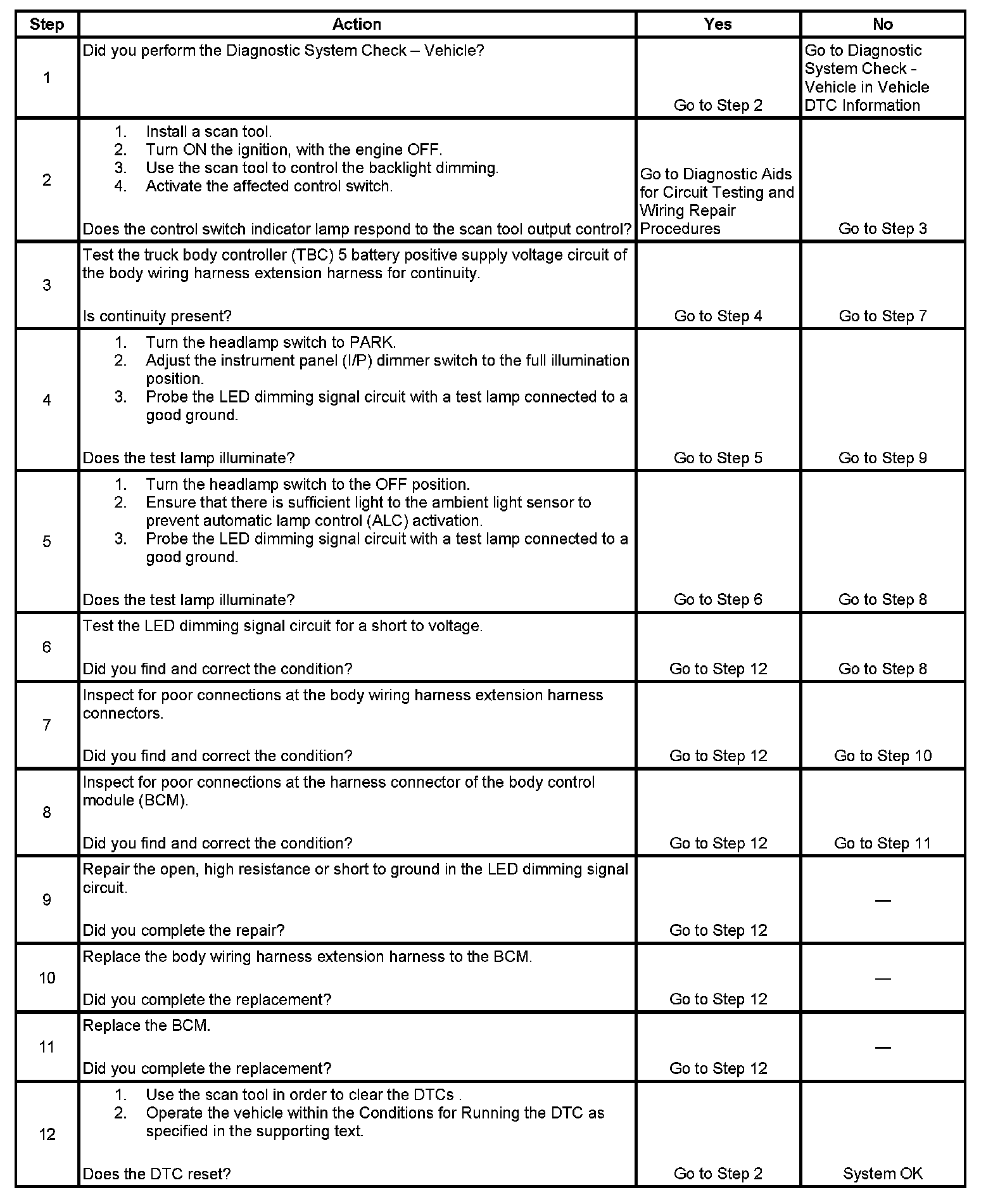 5. Tests for voltage at the LED dimming signal circuit when the headlamp switch is in the OFF position.