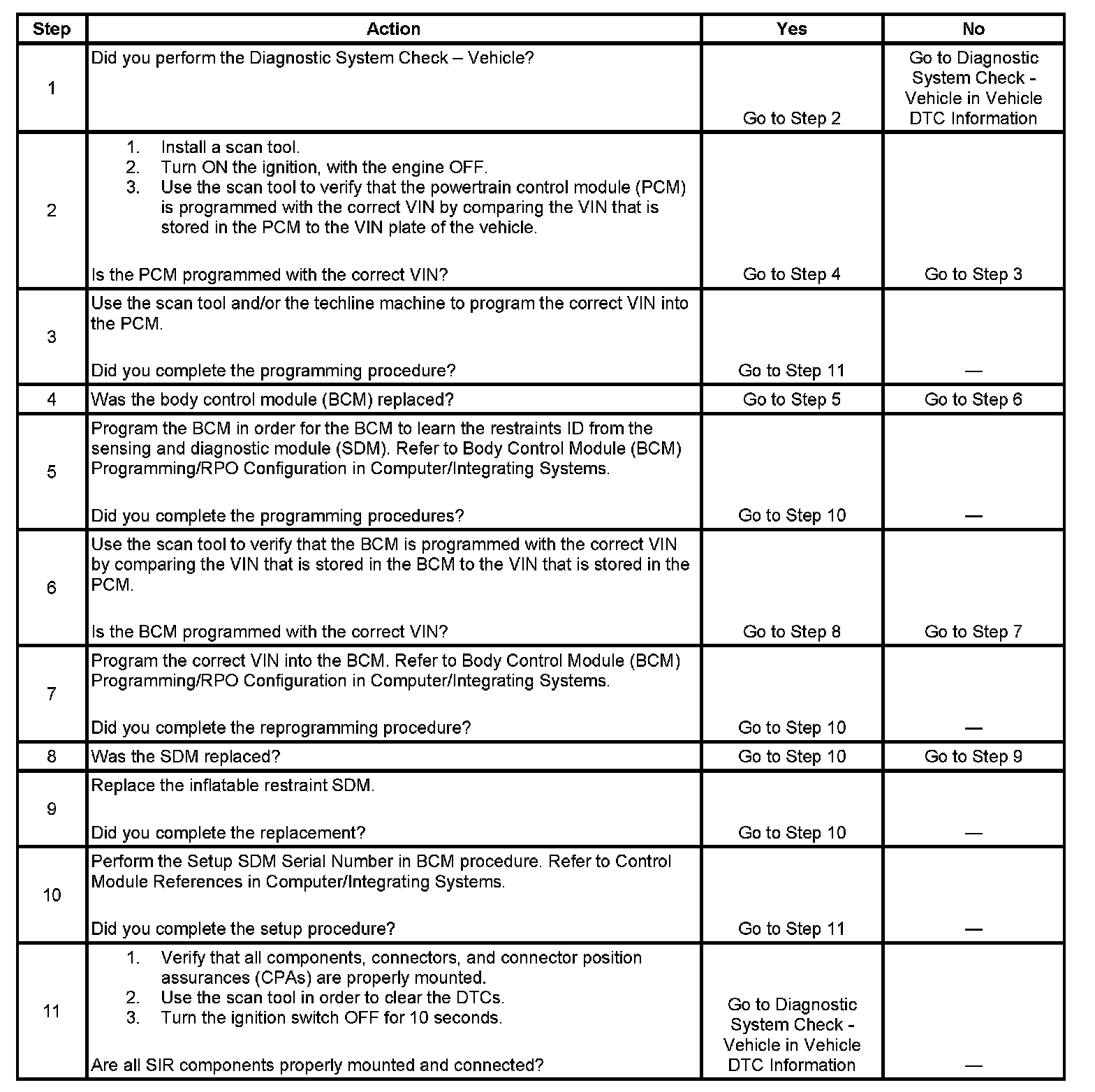 - The restraints ID stored in the SDM does not match the restraints ID stored in the BCM, or the VIN information stored in the SDM does not match the VIN information stored in the BCM.
