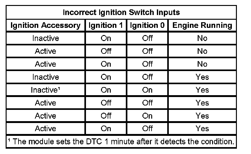One of the 3 monitored ignition switch circuits has malfunctioned. The DTC will set, if one of the given situations is present.