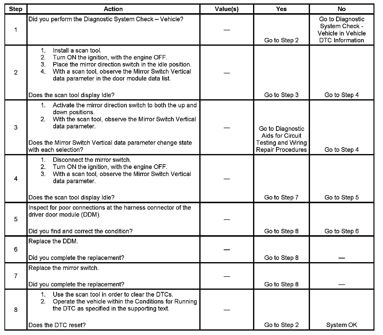 The driver door module (DDM) supplies battery positive voltage to the power mirror switch. When the mirror direction switch is placed in the up or down position, the appropriate signal circuit is switched to battery voltage. The driver door module senses the voltage change and activates the selected outside rearview mirror in the appropriate direction.