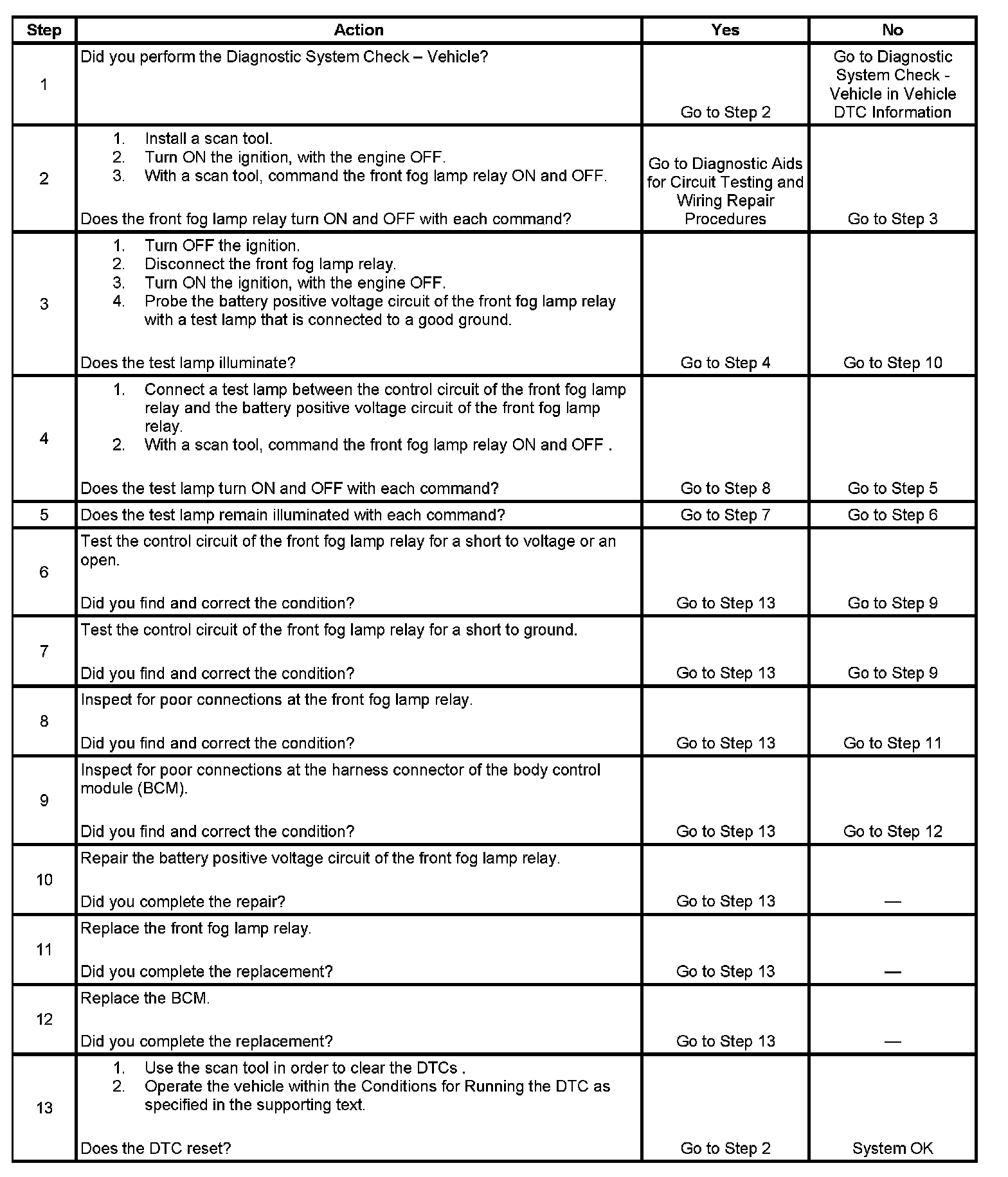 6. This step tests if there is opposing voltage present or an open in the front fog lamp relay control circuit.