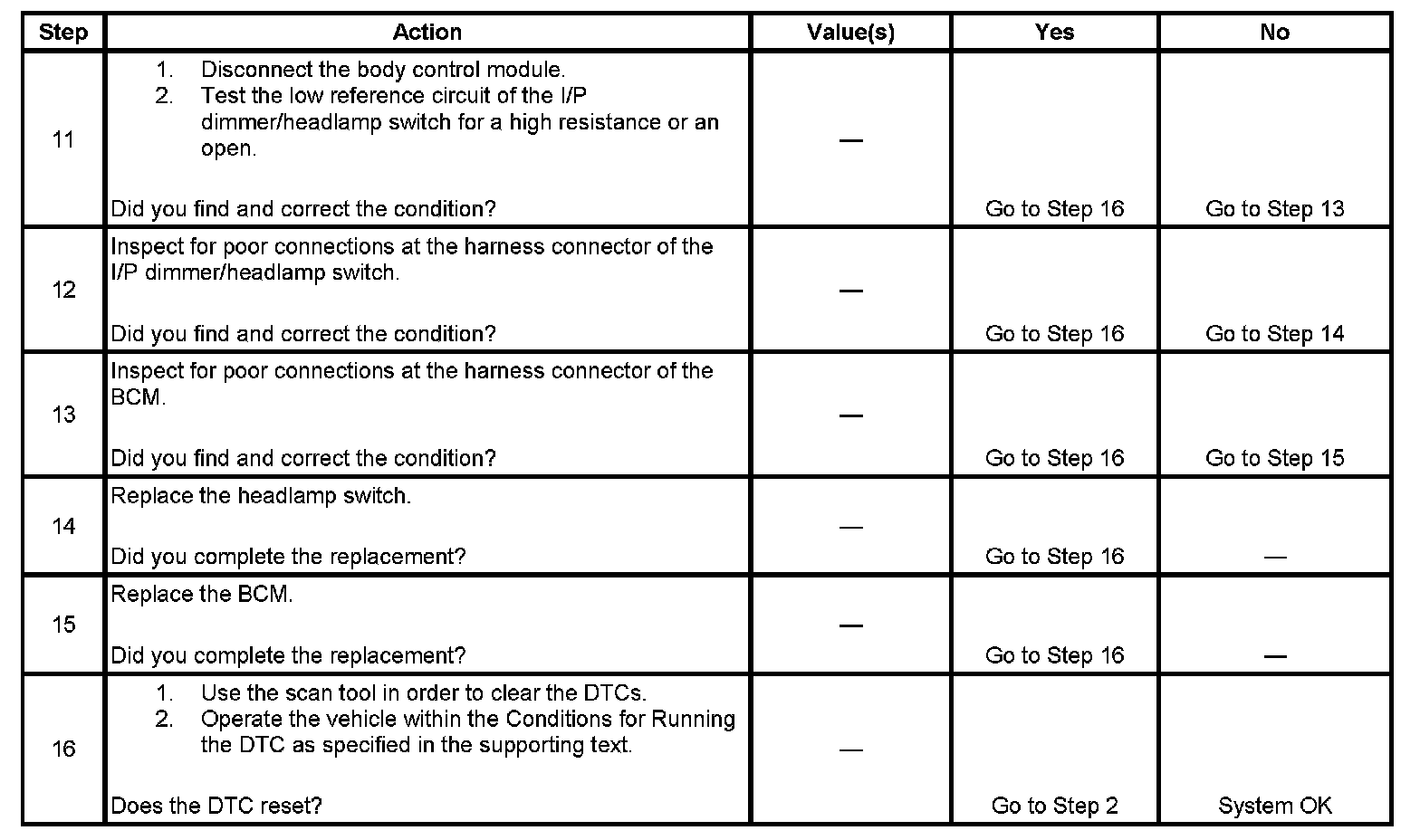 The body control module (BCM) directly sends a 5-volt reference voltage to the instrument panel (I/P) dimmer switch which is then adjusted based on the I/P dimmer switch position and returned as a low reference and a signal to the BCM. The BCM uses this signal to directly control the desired level of instrument panel illumination lamp intensity.