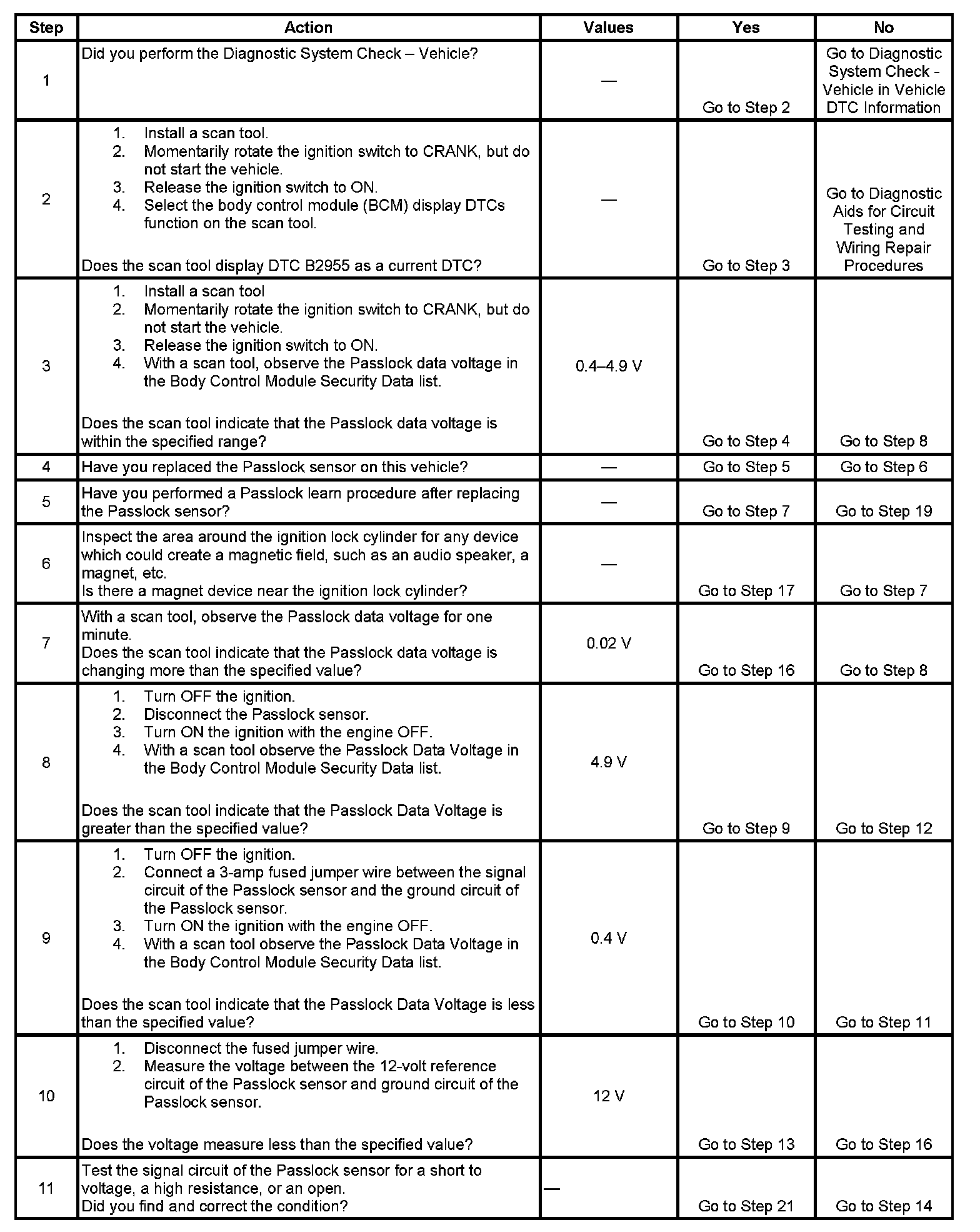 The Passlock system is provided in order to prevent vehicle theft if the ignition lock is forced to rotate or the ignition switch is operated while separated from the ignition lock cylinder case. The body control module (BCM) provides security system sensor power and low reference for the Passlock sensor. The BCM also measures the security system sensor voltage. When the correct key is used to start the vehicle, a magnet on the lock cylinder passes close to the Passlock sensor within the ignition lock cylinder case. The magnet activates the security hall effect sensor in the Passlock sensor which completes a circuit from the security sensor signal circuit through a resistor to the security sensor low reference circuit. The resistance value will vary from vehicle to vehicle. The BCM will measure the voltage on the security sensor signal circuit and compare this voltage to a previously learned voltage. If the voltage measured is within the valid range, the BCM will send a class 2 message to the powertrain control module (PCM) to enable vehicle starting. If the voltage measured is not within the valid range, a class 2 message will be sent to the PCM to disable starting of the vehicle.