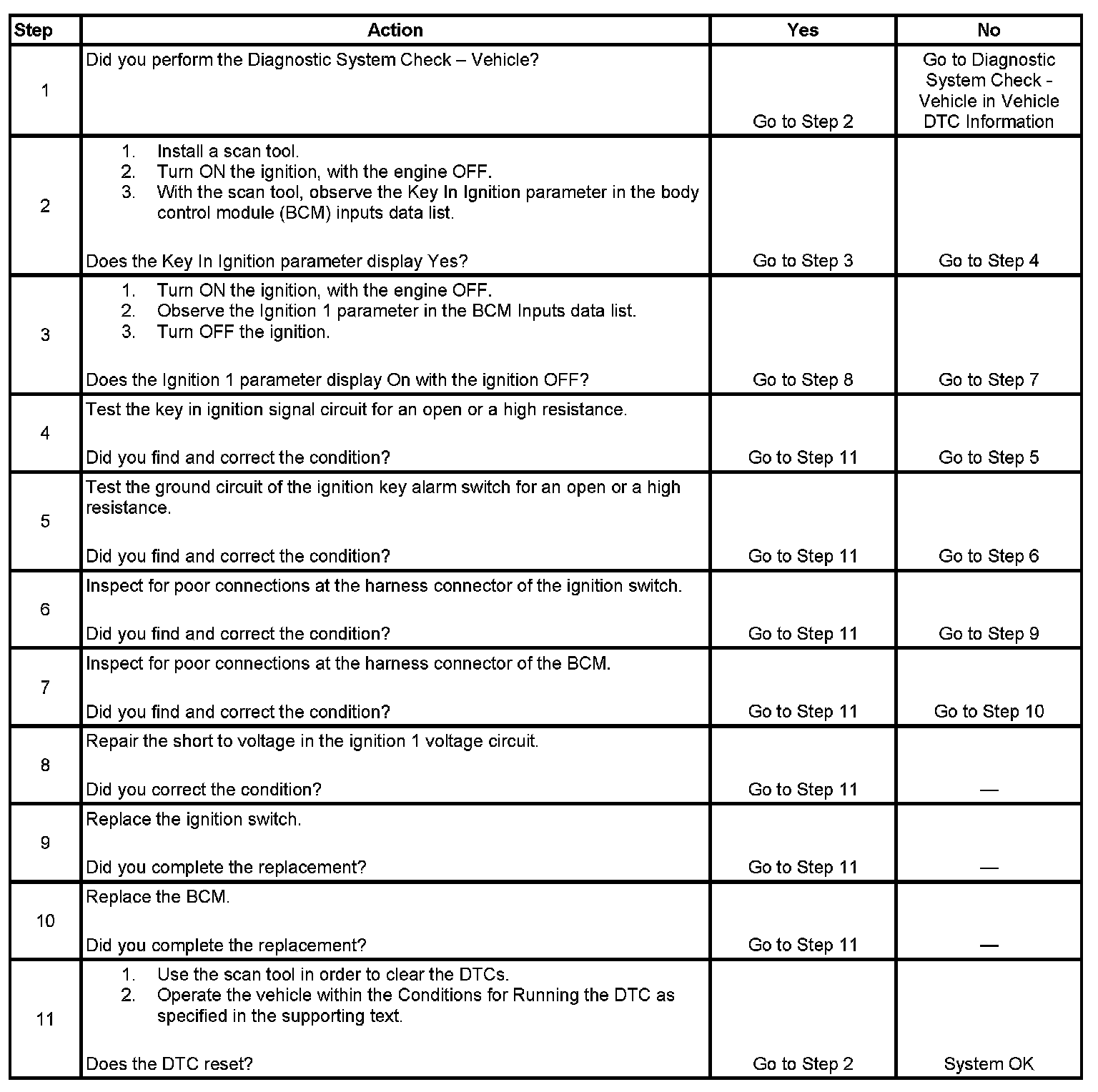 - The ignition 1 input is active and the key in ignition switch signal circuit is inactive (signal circuit is high).